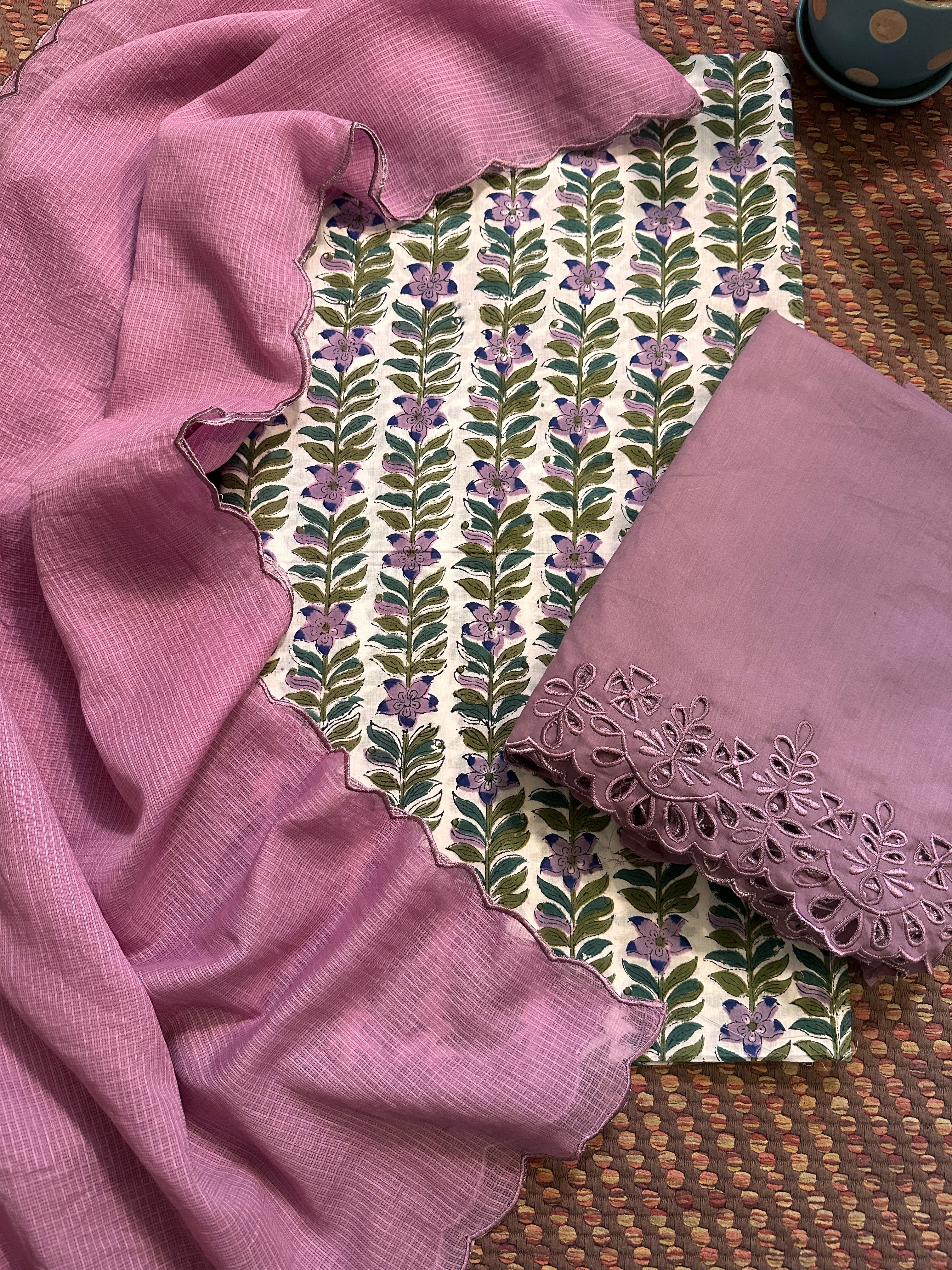 Pure Cotton Handblock Fabric with Exclusive Cutwork Bottom & Kota Doria Dupatta - Unstitched Set