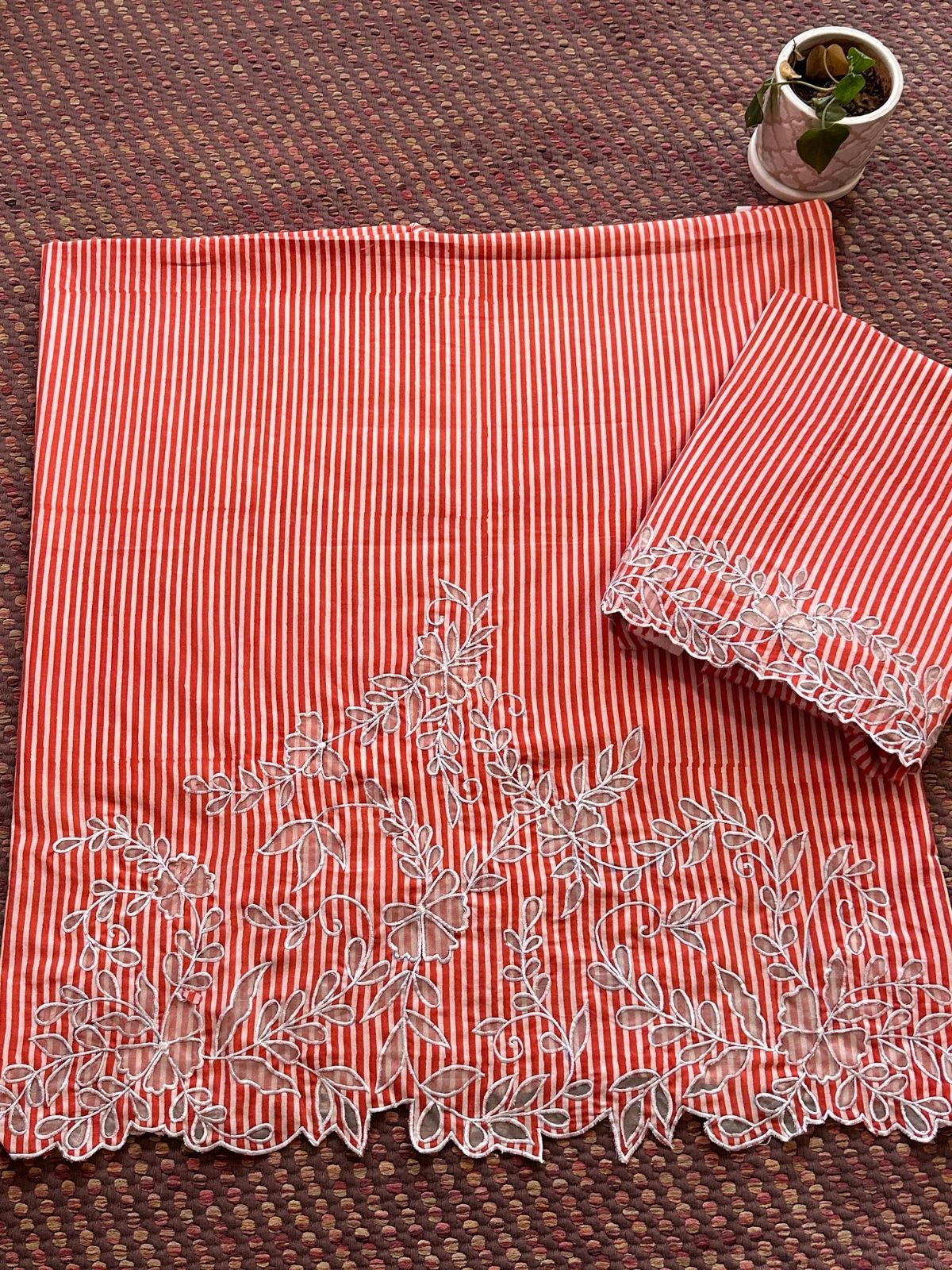 Bottom: Soft Pure cotton in hand-blocked 2.5 meter with exclusive cutwork embroidery done on front bottom panel and sleeves with organza patch work. *Embroidery done in this set is delicate, therefore Dry Clean Only.