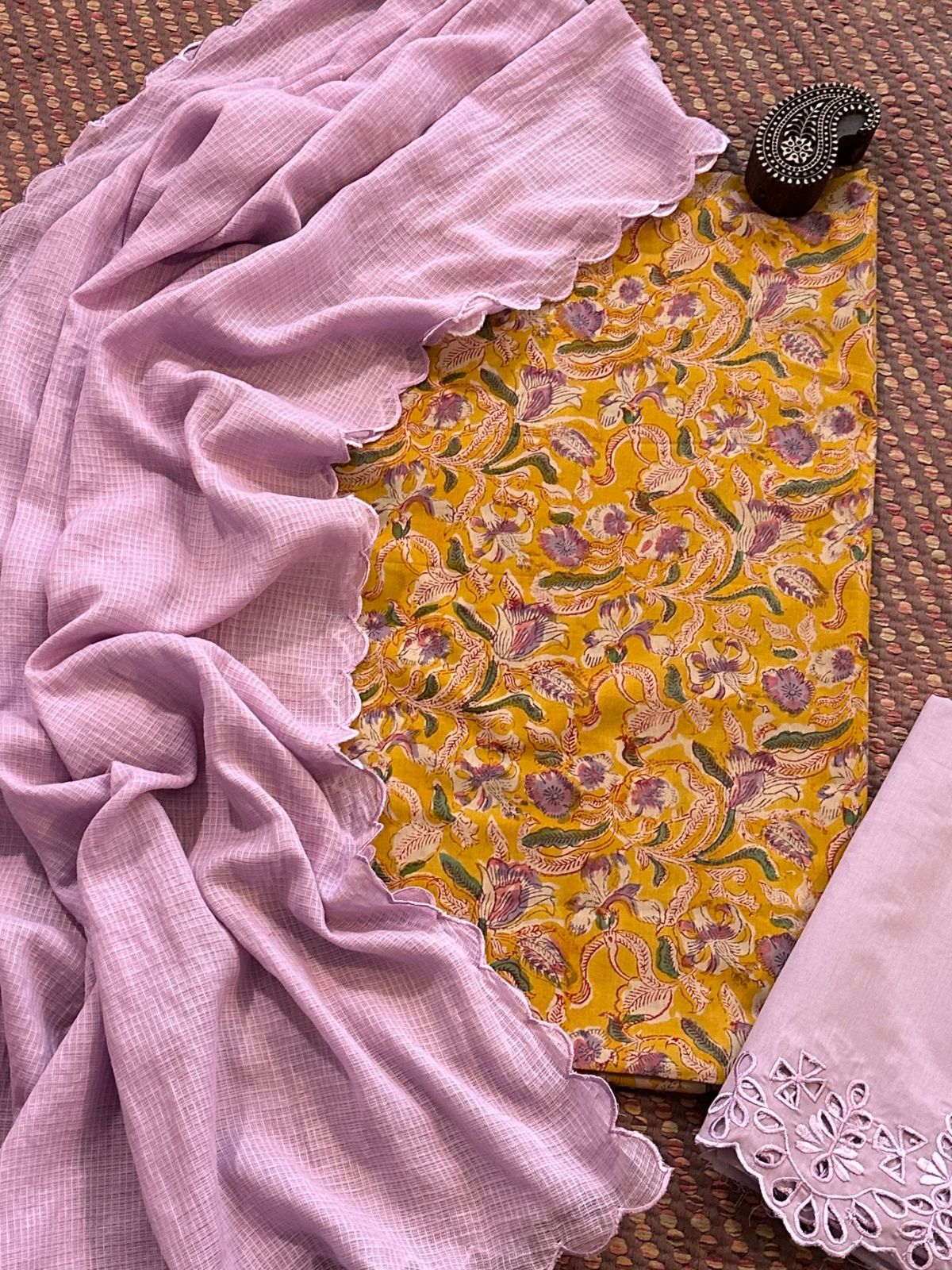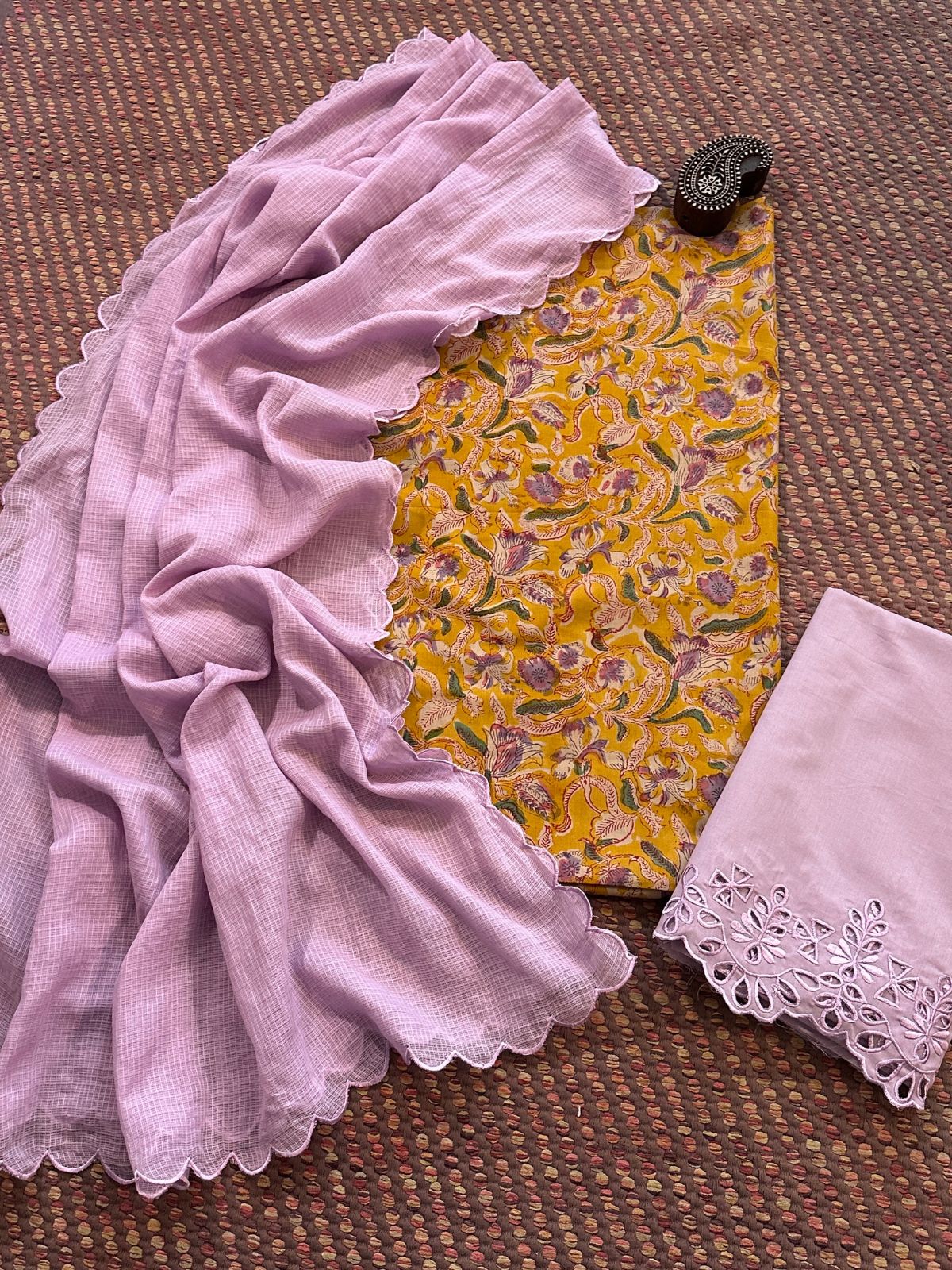 Pure Cotton Malmal Hand-blocked Fabric with Cutwork Bottom & Kota Doria Dupatta - Unstitched Set