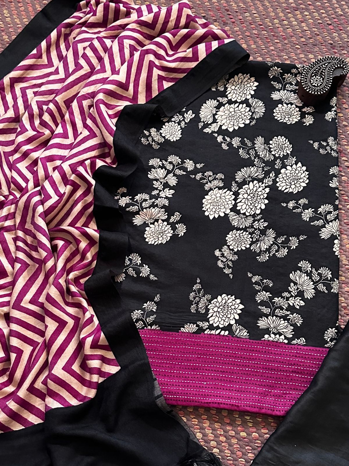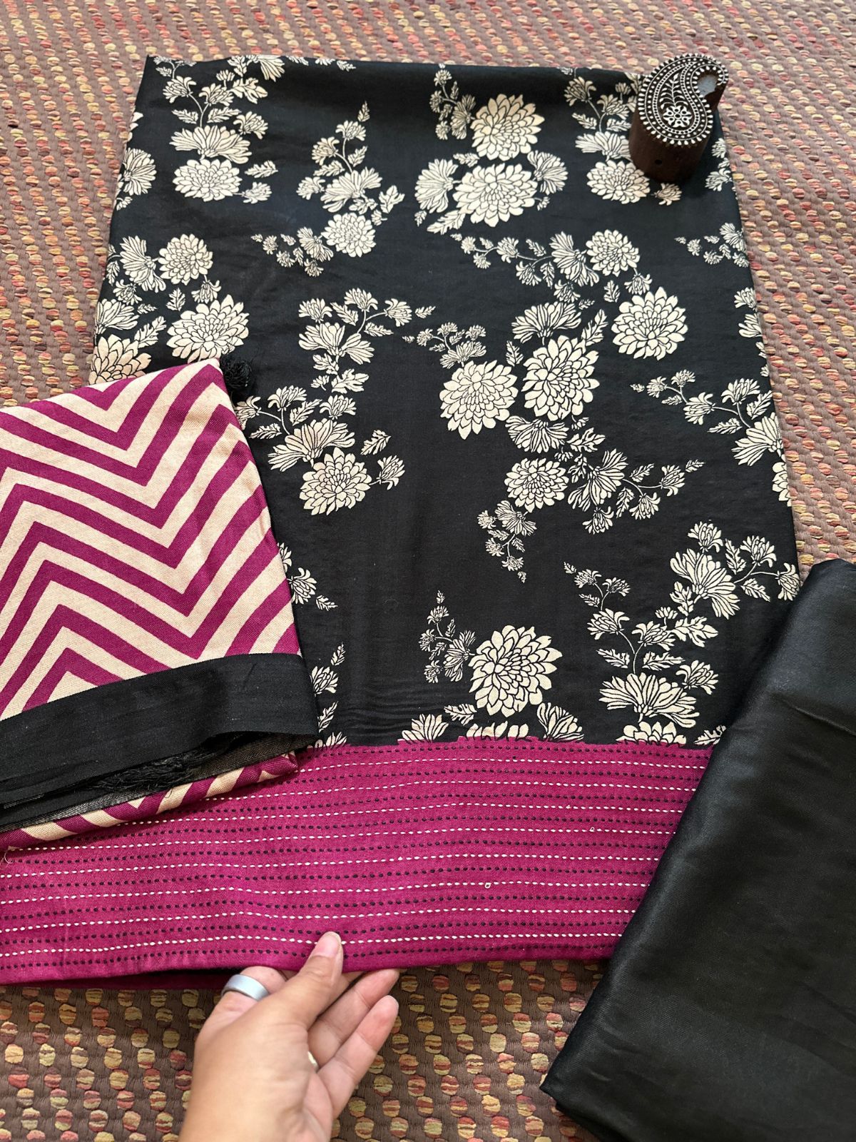 Fabric: Spun block printed 2.5 meter each for top & bottom. Top fabric has kantha stitich pattern on front.