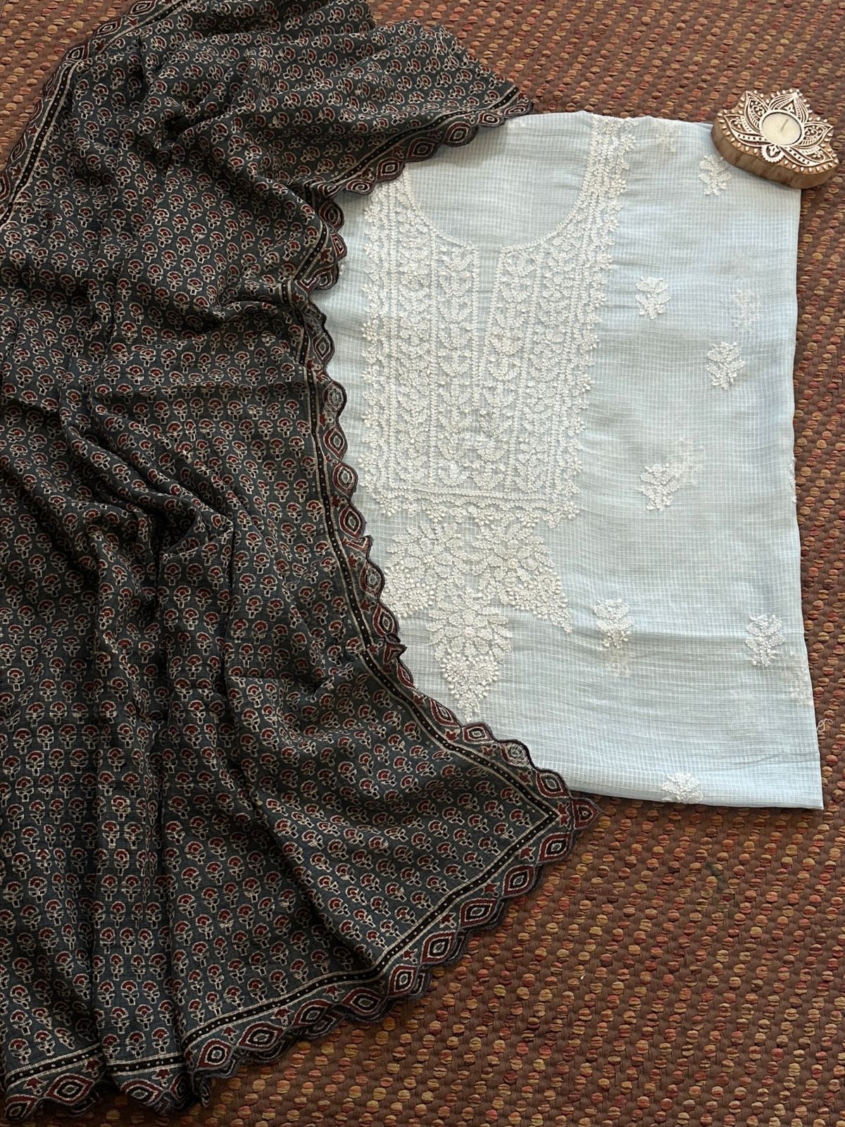 Pastel Blue Chikankari Hand Embroidered Fabric with Ajrak Hadblocked Kota Dupatta - chikankari hand embroidered unstitched set