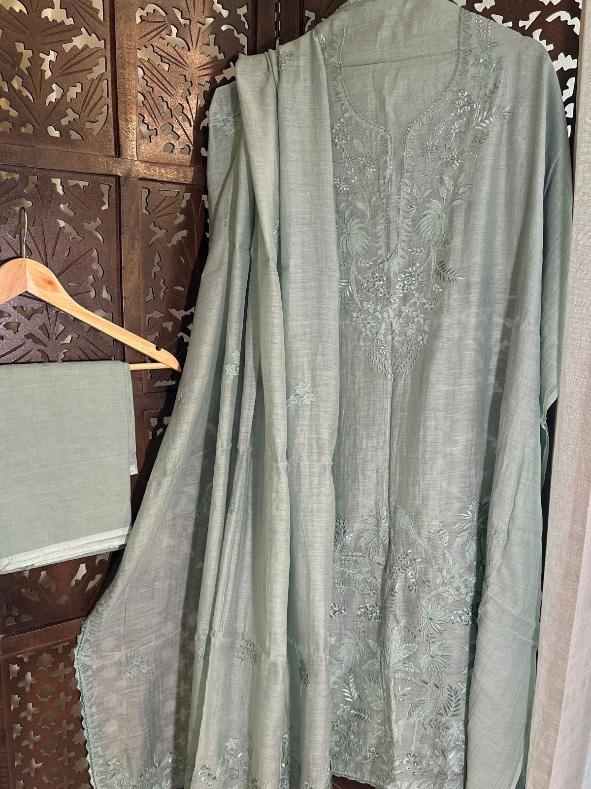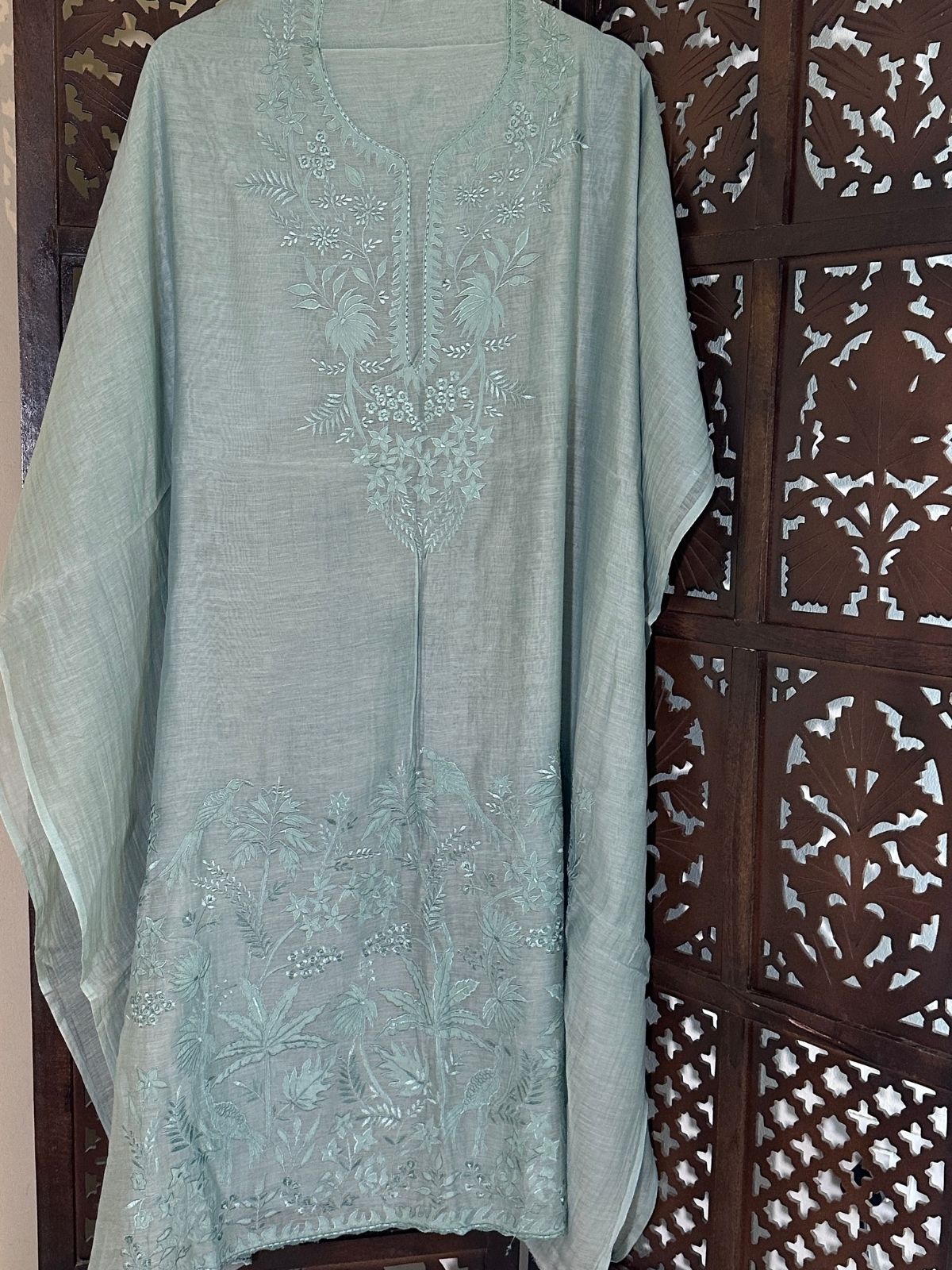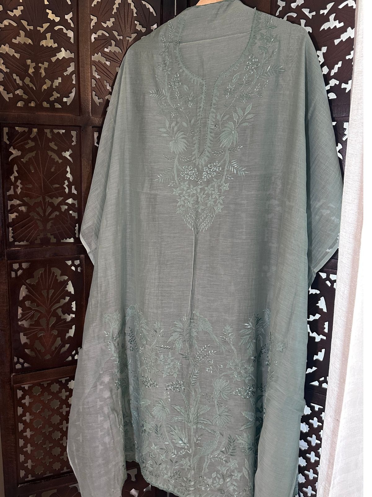 Kurti Fabric: Feather Soft Malmal Maheshwari fabric 3 meter, with applique embroidery, will need a lining/inner. Shade: Pastel Sage Blueish.