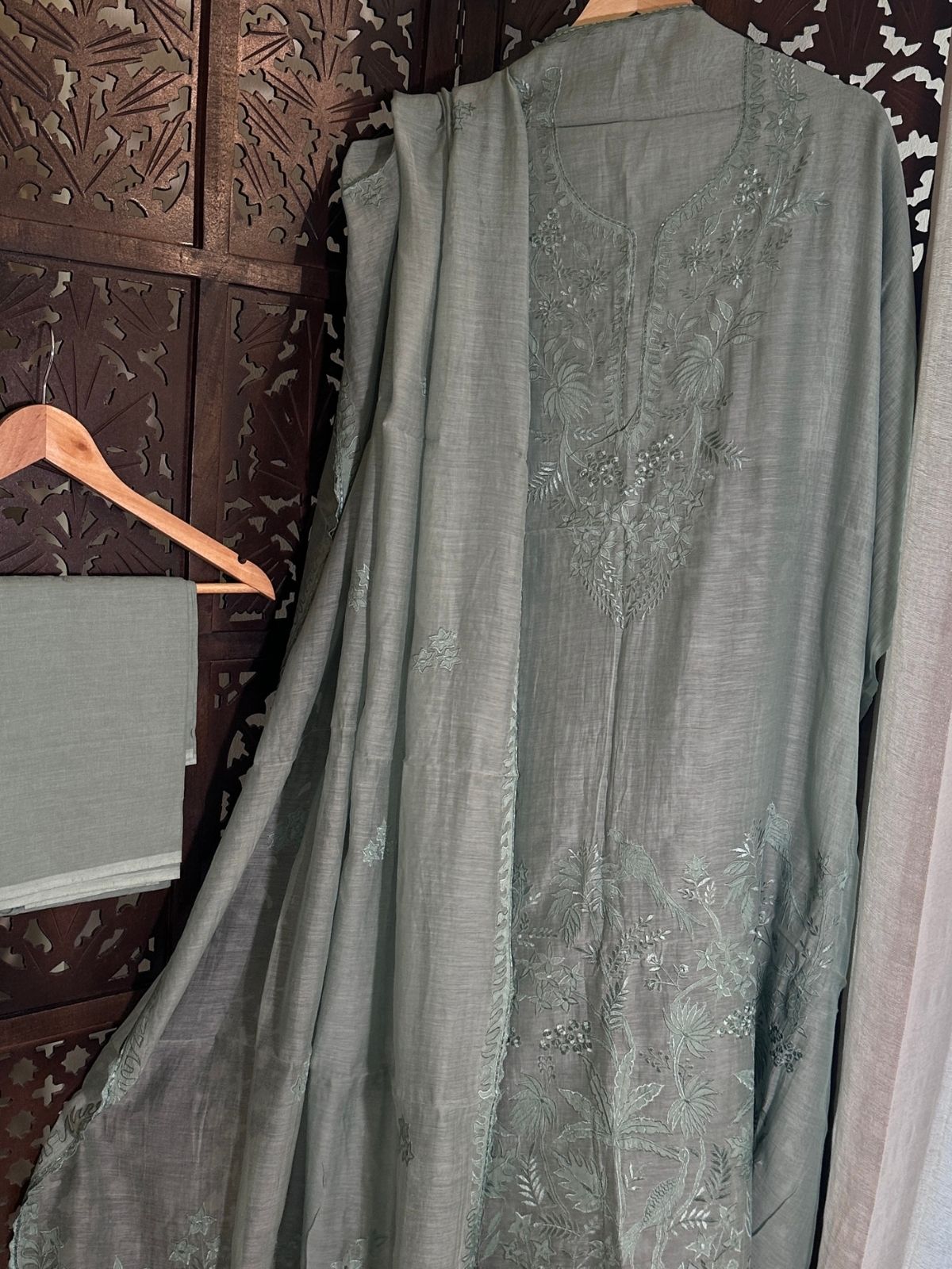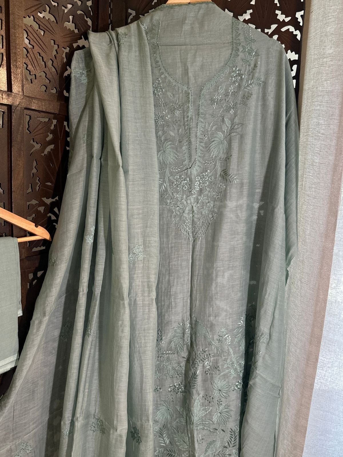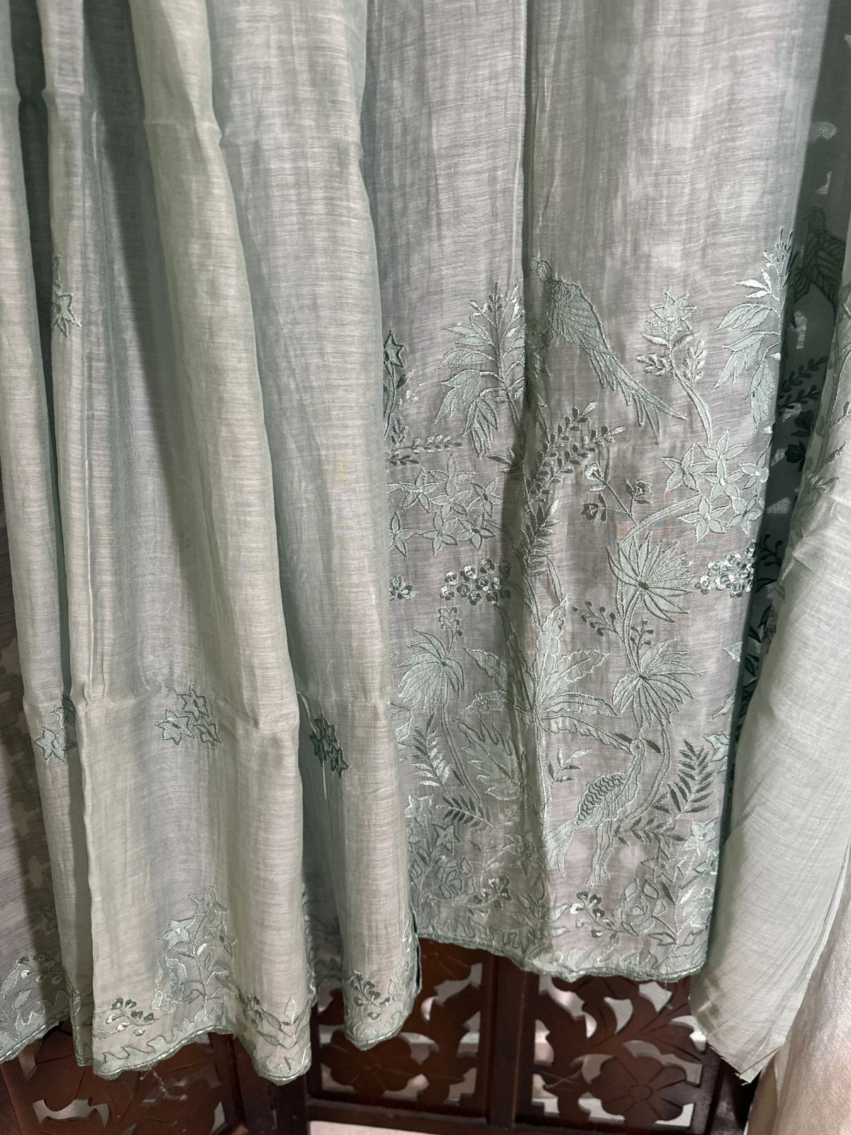Kurti Fabric: Feather Soft Malmal Maheshwari fabric 3 meter, with applique embroidery, will need a lining/inner. Shade: Pastel Sage Blueish.