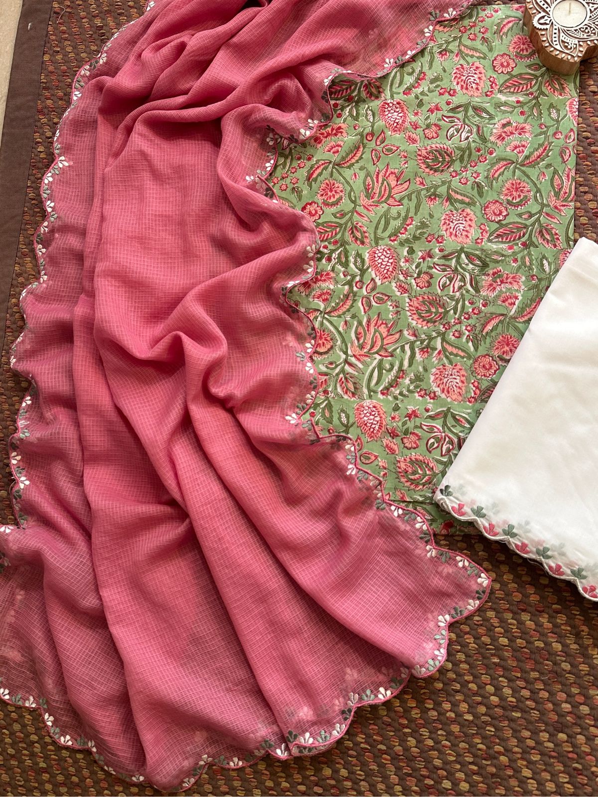 Pure Cotton Hand-block Fabric with Embroidered Bottom & Kota Doria Dupatta - Unstitched Set