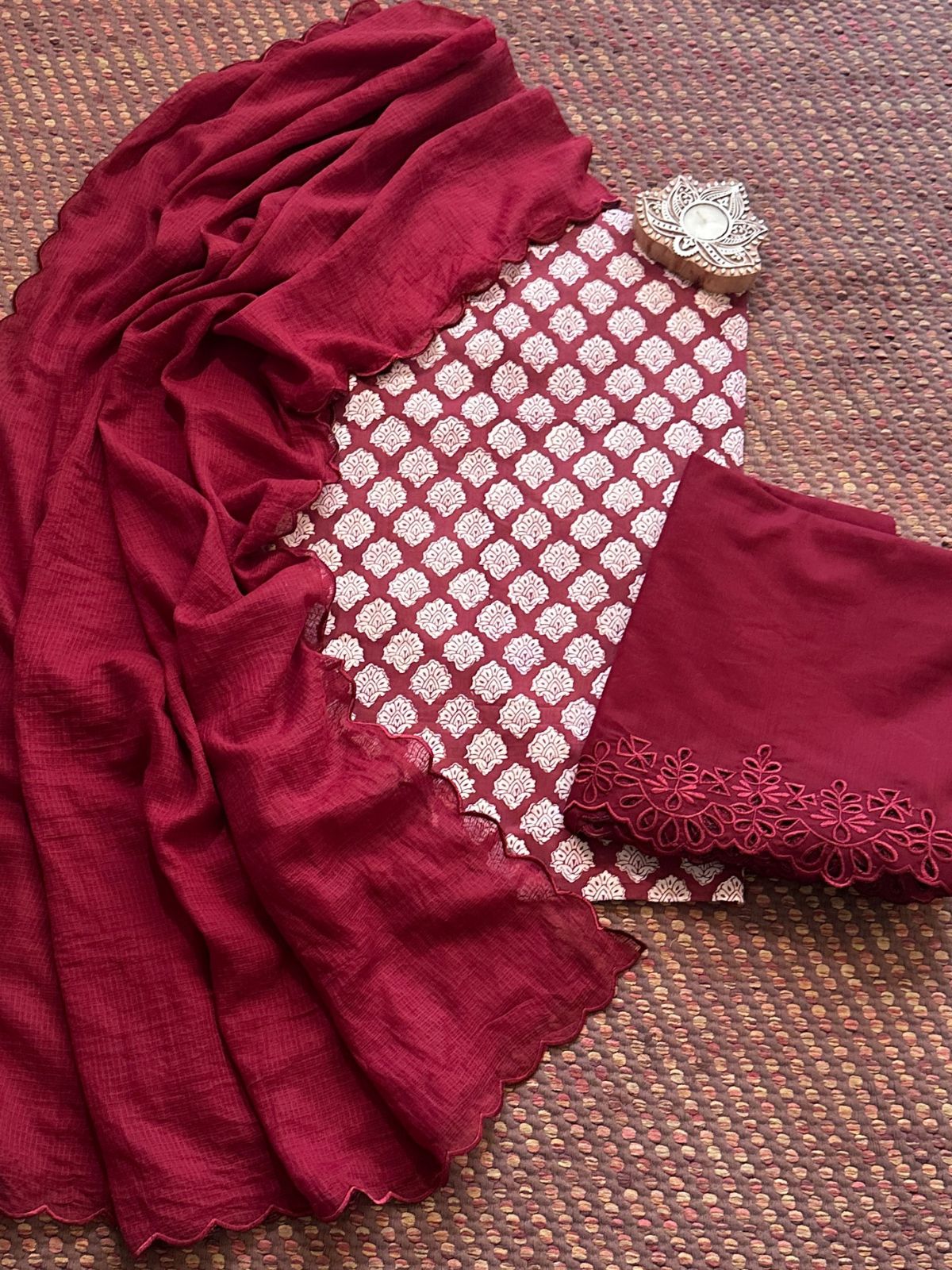 Pure Cotton Hand-blocked Fabric with Cutwork Bottom & Kota Doria Dupatta - Unstitched Set