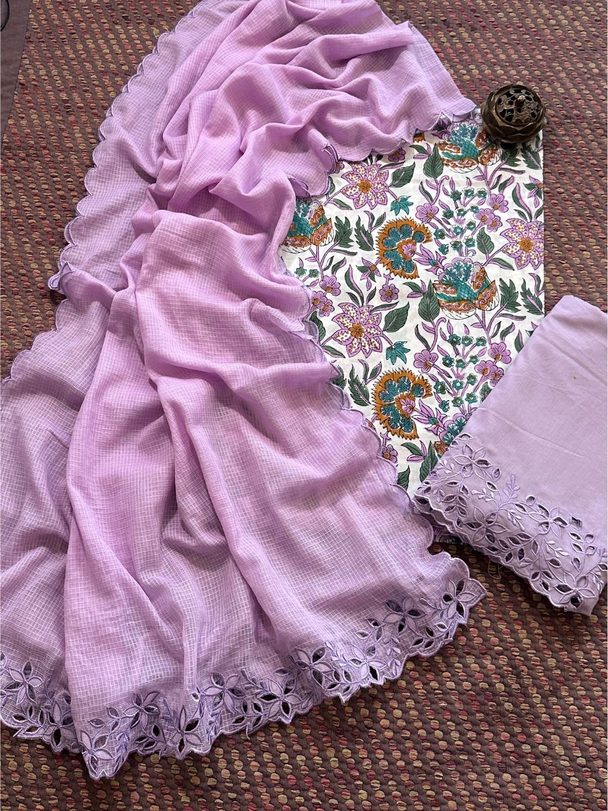 Pure Cotton Malmal Hand-blocked Fabric with Cutwork Bottom & Kota Doria Dupatta - Unstitched Set