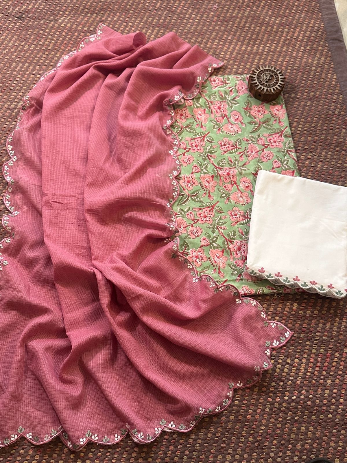 Pure Cotton Hand-block Fabric with Exclusive Embroidered Bottom & Kota Doria DupattaRegular price ₹ 3,200.00