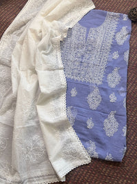 Chikankari Hand Embroidered Fabric with Kota Embroidered Dupatta - chikankari hand embroidered unstitched set