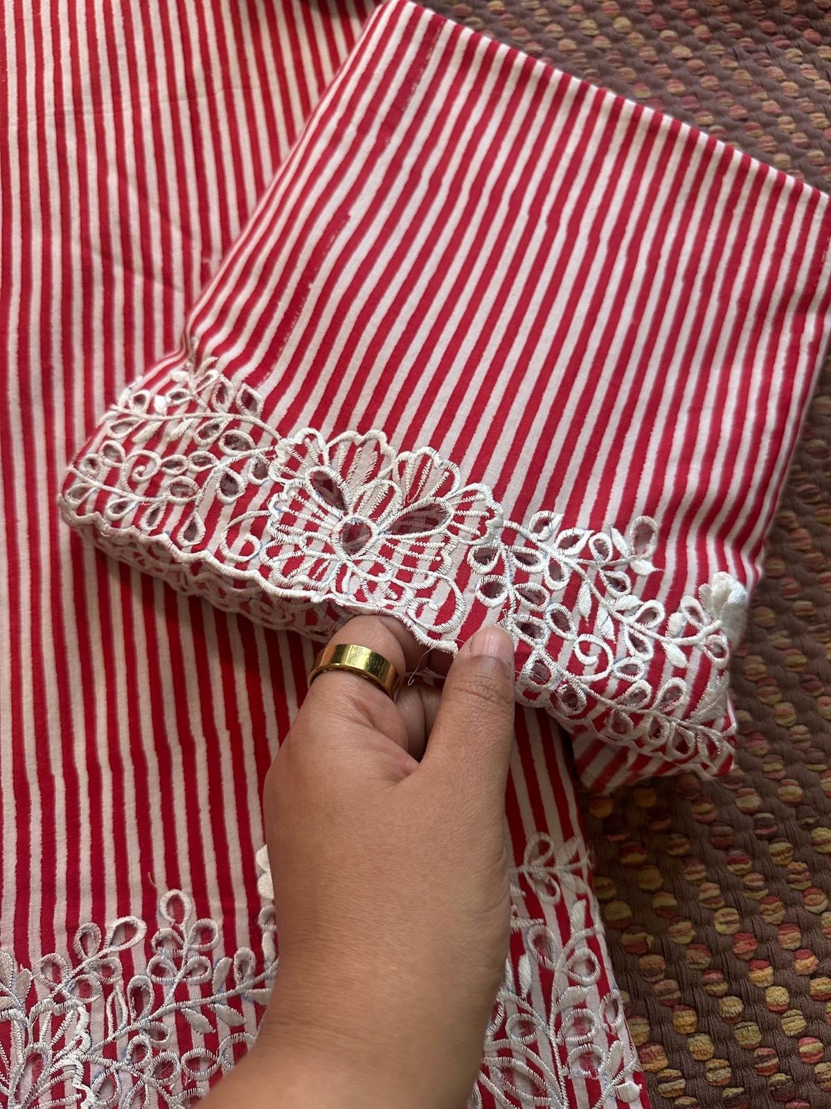 Product Type: 2 Piece Set, No dupatta, unstitched fabric with Cutwork embroidery. Stripes Shade: Red