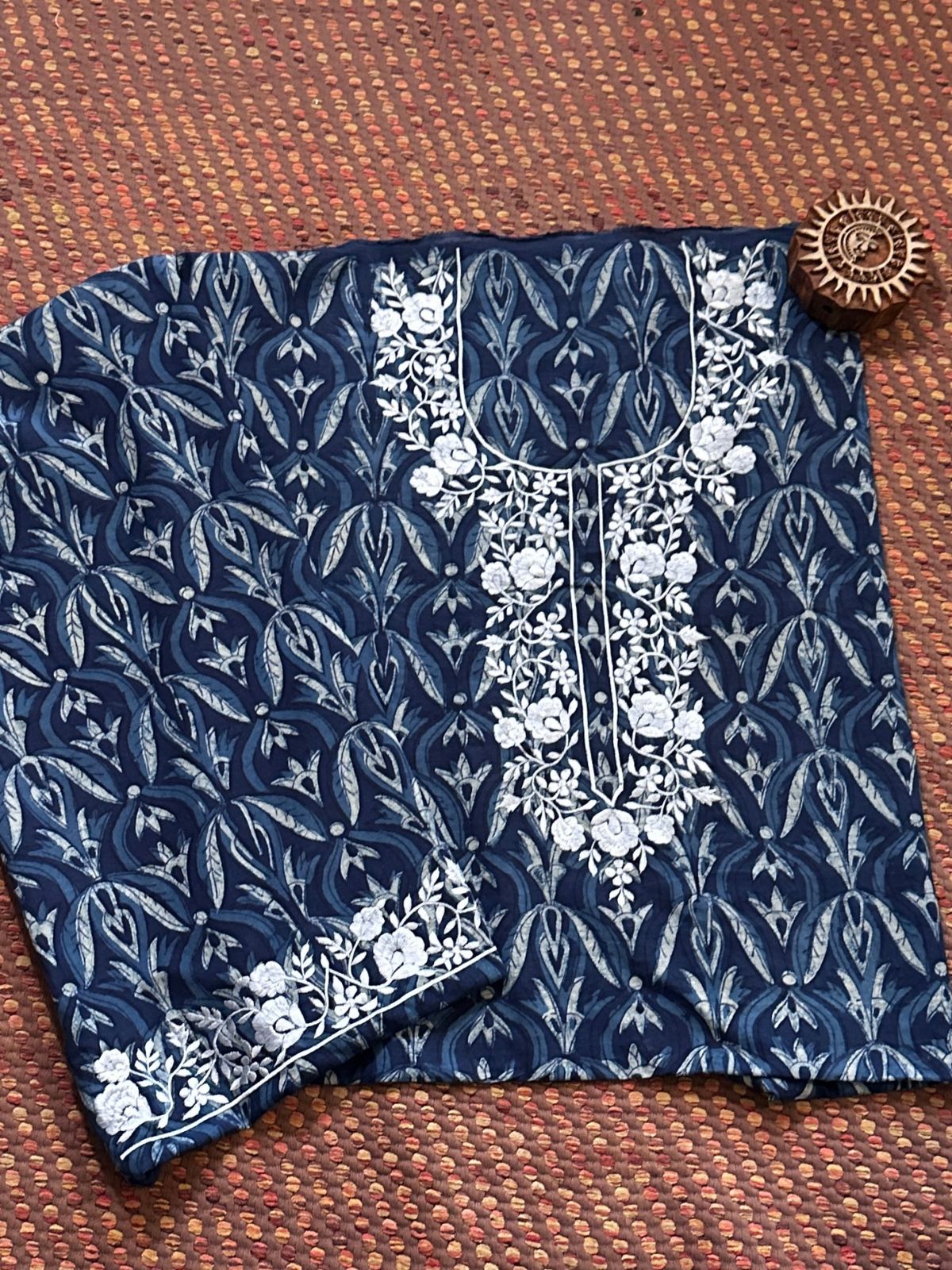 Product Type: 2.5 meters Unstitched Kurta Fabric. Pure cotton Indigo fabric where embroidery is done on the neck panel & Sleeves in soft pastel blue shade.