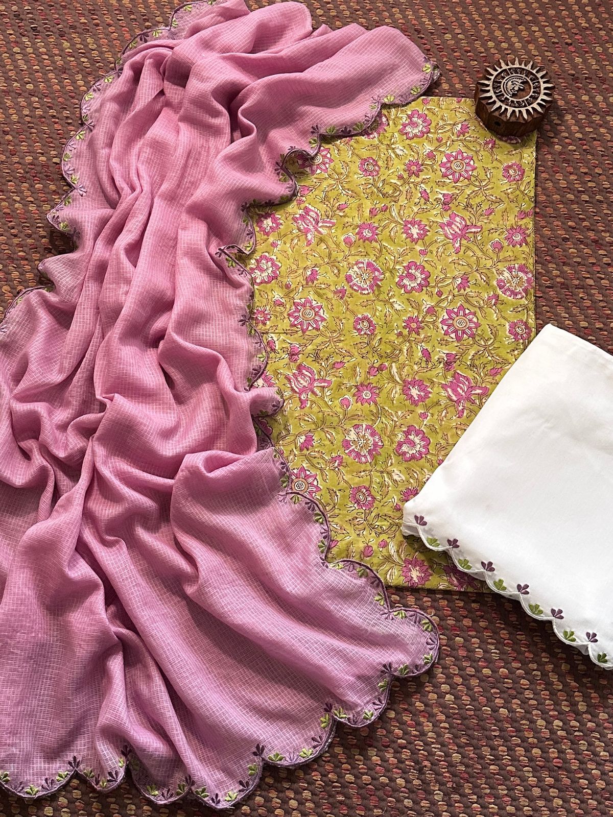 Pure Cotton Hand-block Fabric with Embroidered Bottom & Kota Doria Dupatta - Unstitched Set