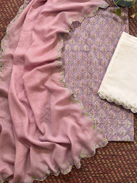 Pure Cotton Hand-block Fabric with Exclusive Embroidered Bottom & Kota Doria Dupatta - Unstitched Set