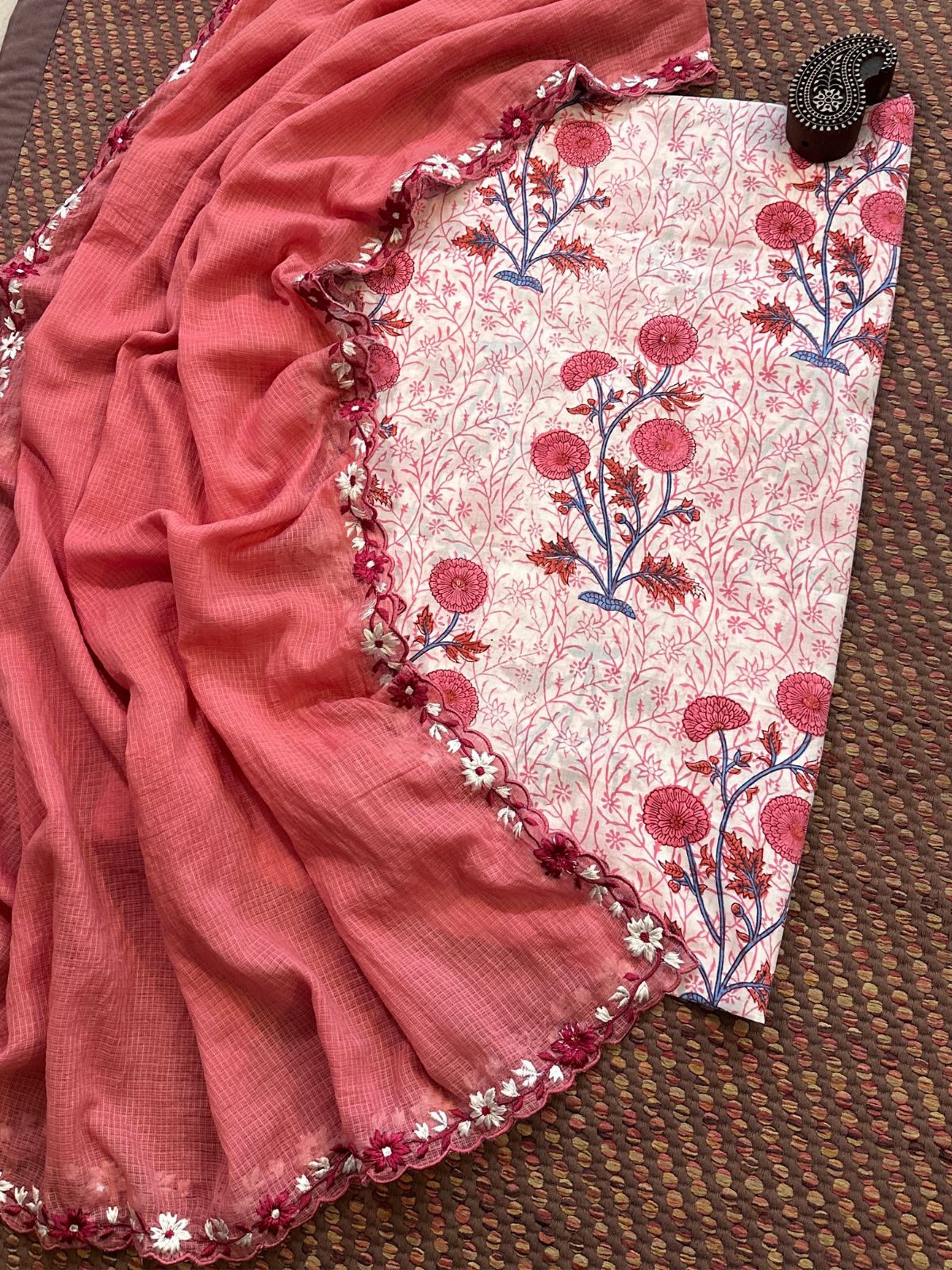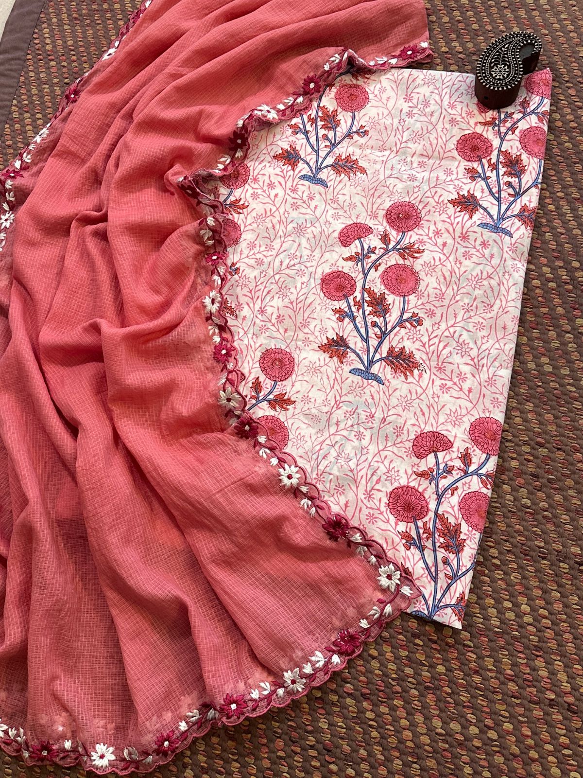Pure Cotton Hand-blocked fabric set with Embroidered Dupatta