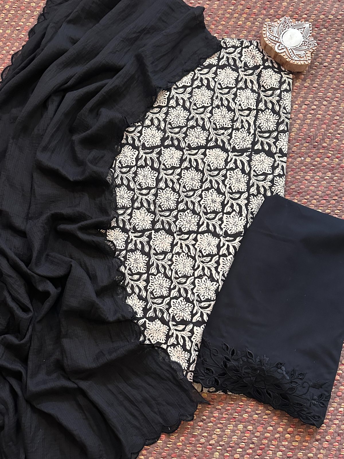 Pure Cotton Hand-blocked Fabric with Cutwork Bottom & Kota Doria Dupatta - Unstitched Set