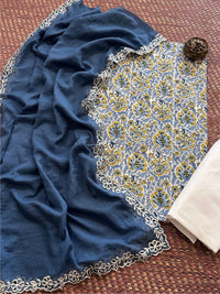 Pure Cotton Malmal Hand-block Fabric set with Cutwork Embroidered Kota Doria Dupatta - Unstitched Set