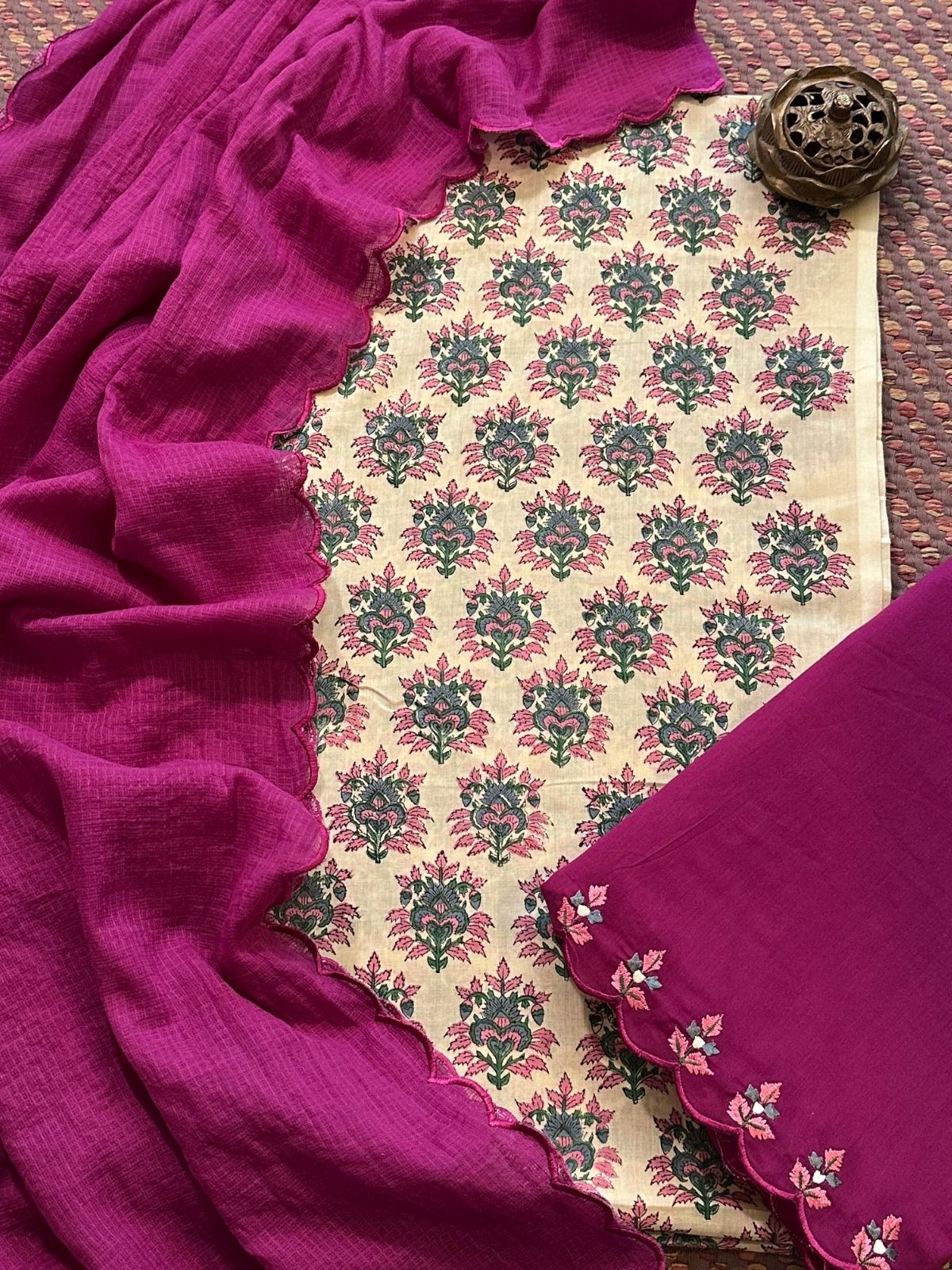 Bottom: 2.5 meter Cotton Cambric with exclusive embroidery & scalloping done , width of embroidery will be approx. 12 inches when stitched