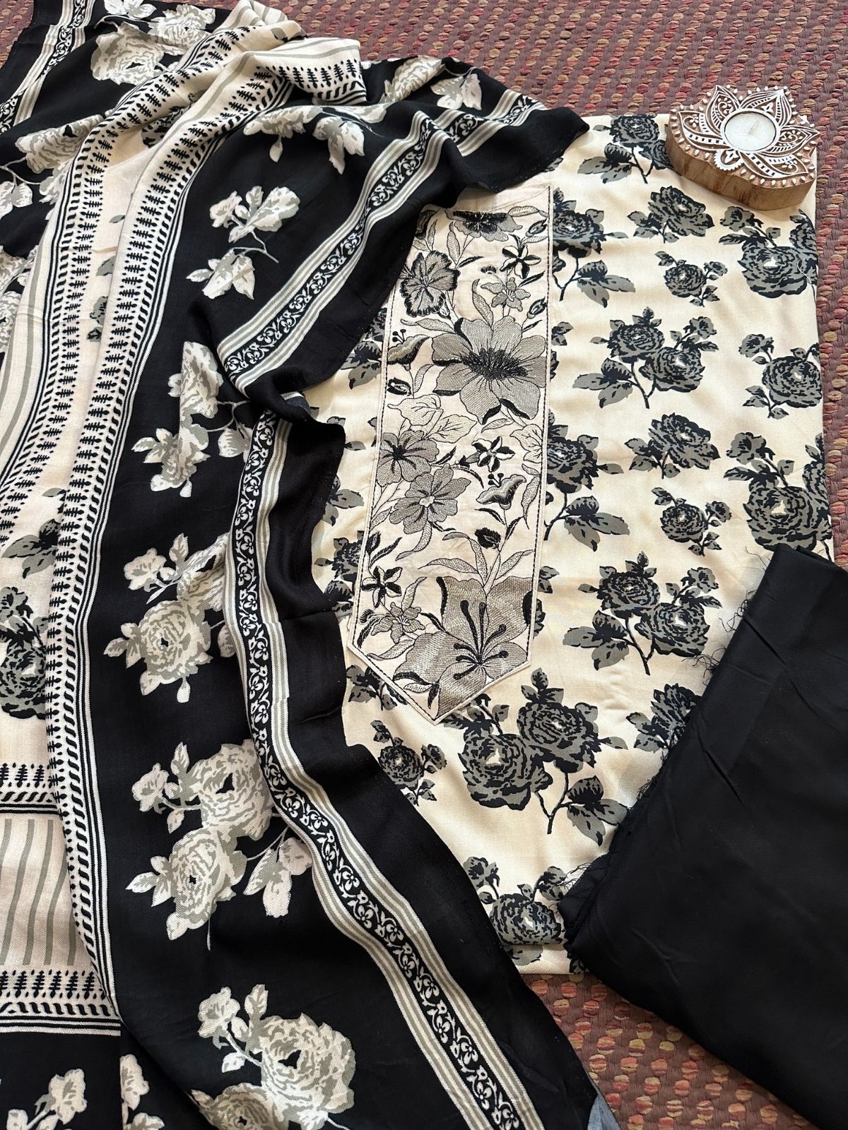 Fabric: Spun block printed 2.5 meter each for top & bottom. Top has embroidery done on the front panel.