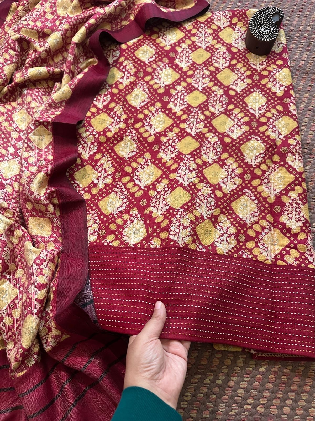 Fabric: Spun block printed 2.5 meter each for top & bottom. Top fabric has kantha stitich pattern on front.