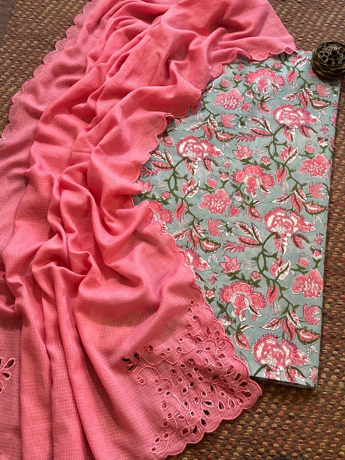 Pure Cotton Hand-blocked Fabric Set with Cutwork Kota Doria Dupatta