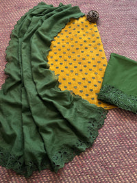 Pure Cotton Malmal Hand-blocked Ajrak Fabric with Cutwork Bottom & Kota Doria Dupatta - Unstitched Set