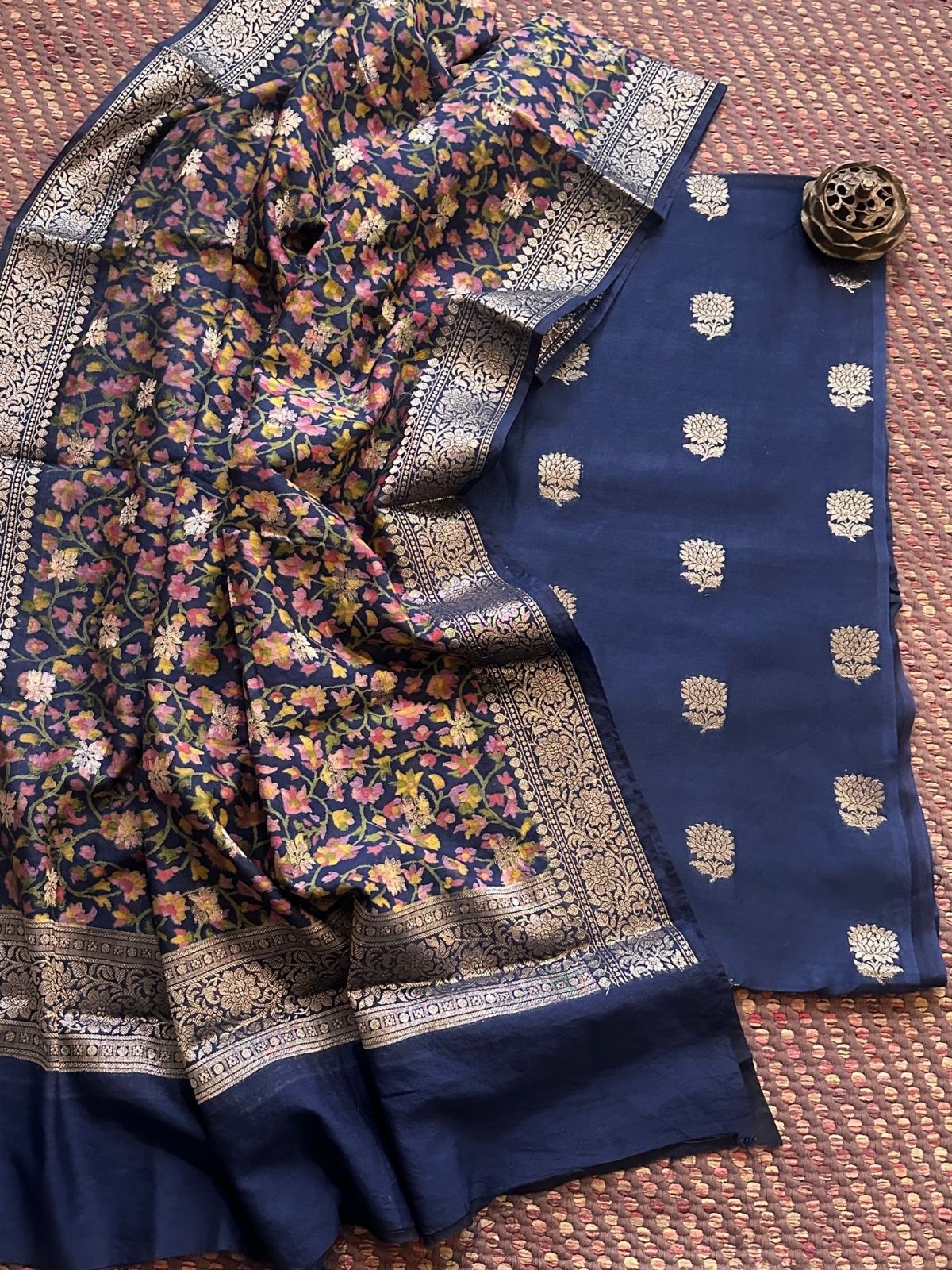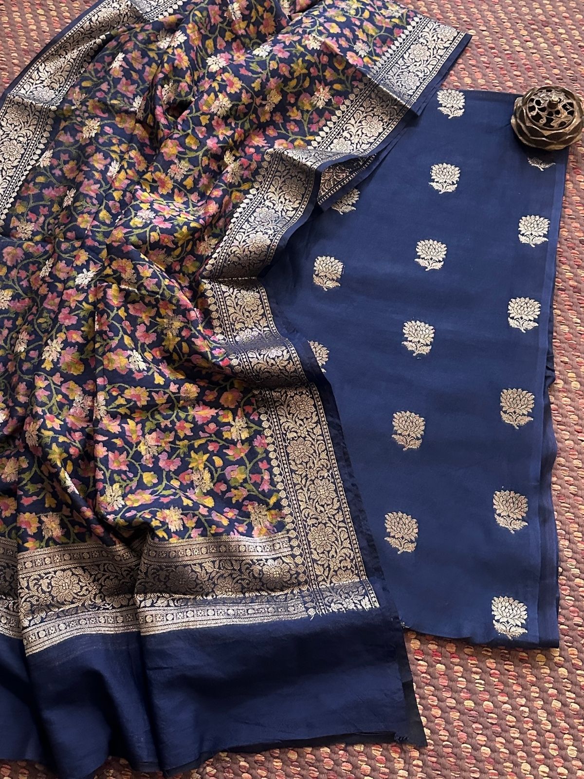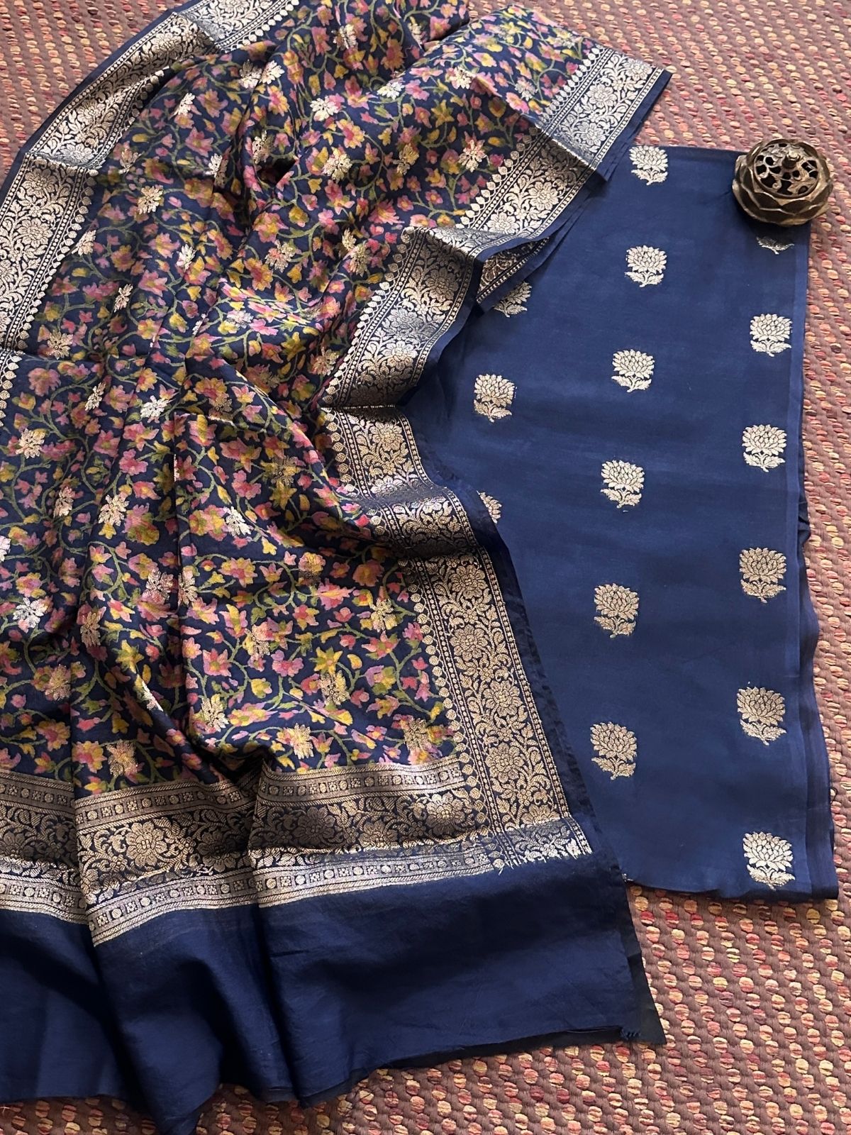 Kurti: Fabric: Maheshwari Silk Cotton, 2.5 meter with benarsi weave motifs. Dupatta: 2.5 meter Maheshwari Silk Cotton with benarsi motifs.. Bottom: 2.5 meter cotton silk.