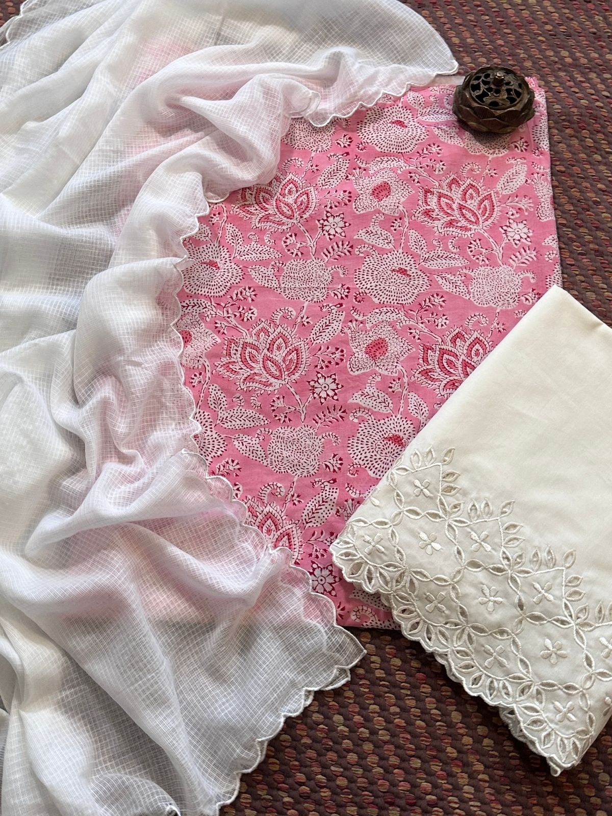 Pure Cotton Hand-blocked Fabric with Cutwork Bottom & Kota Doria Dupatta - Unstitched Set