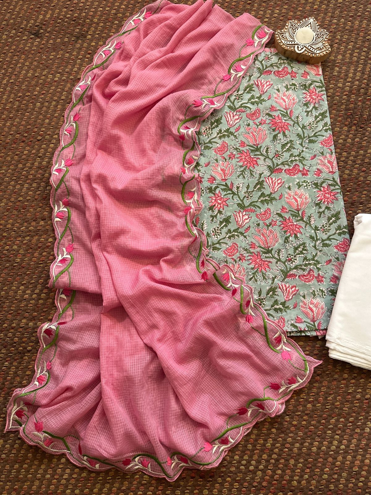 Pure Cotton Hand-blocked Fabric with Embroidered Dupatta