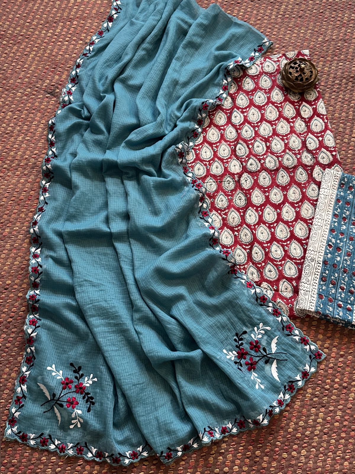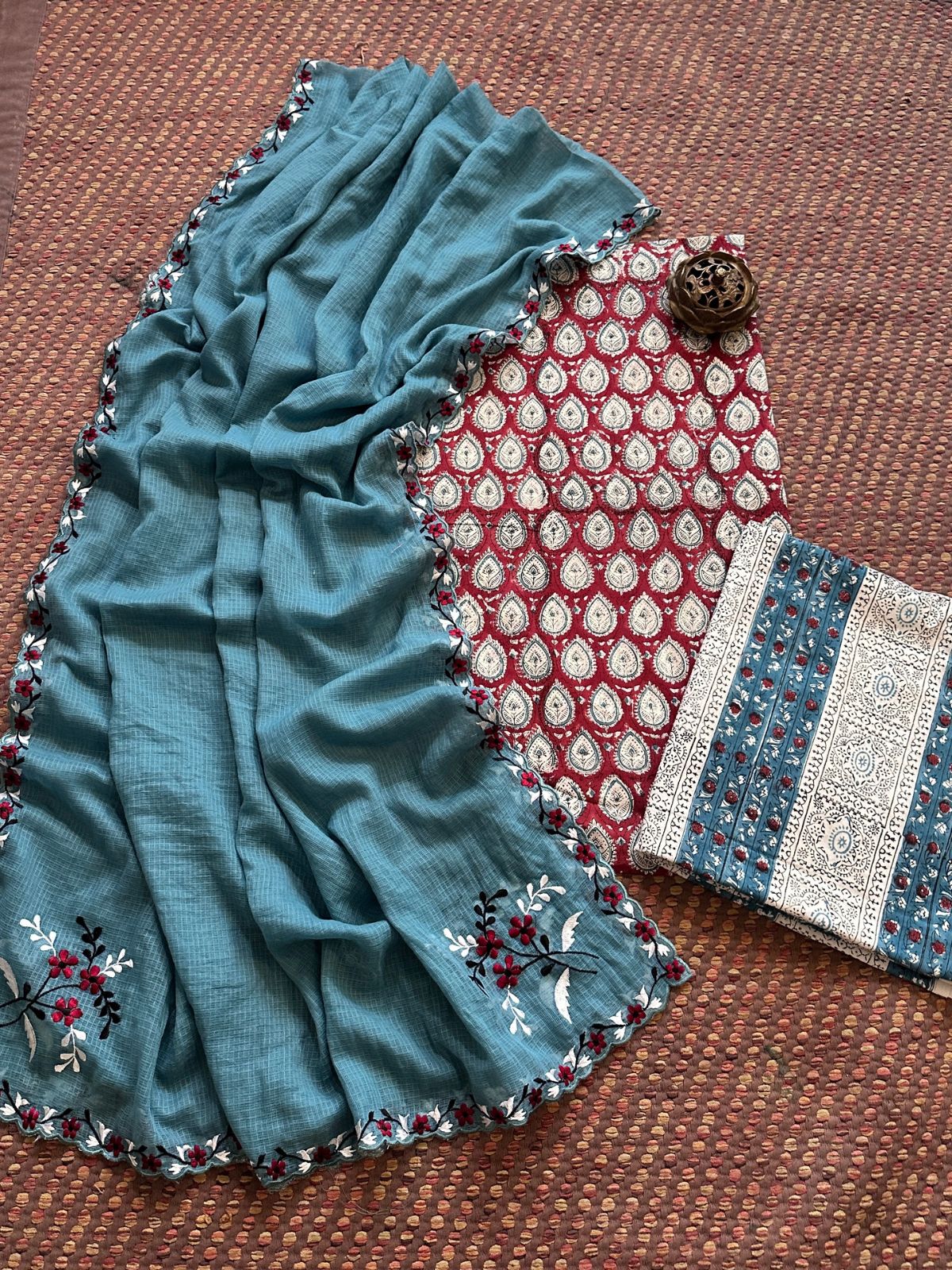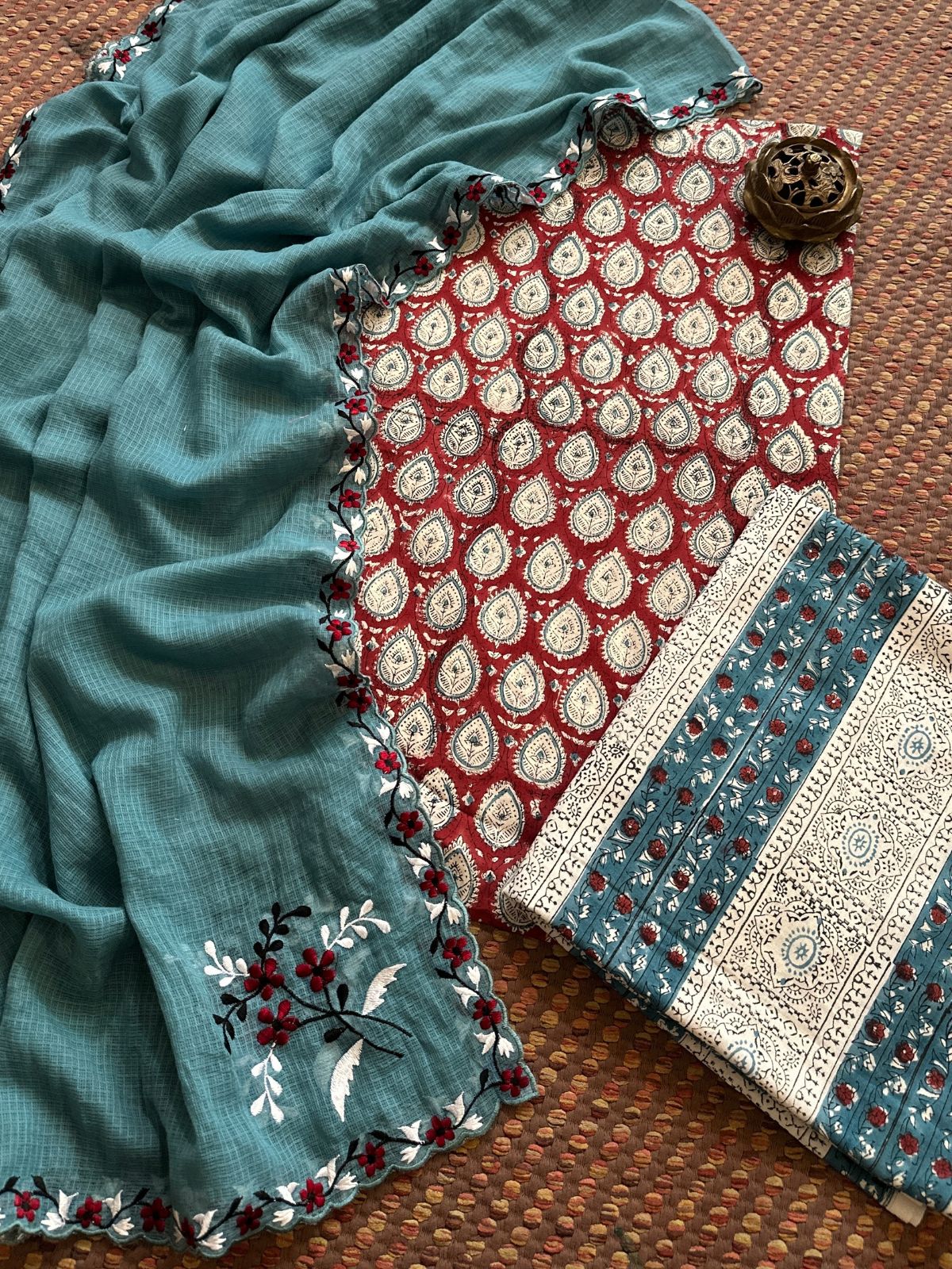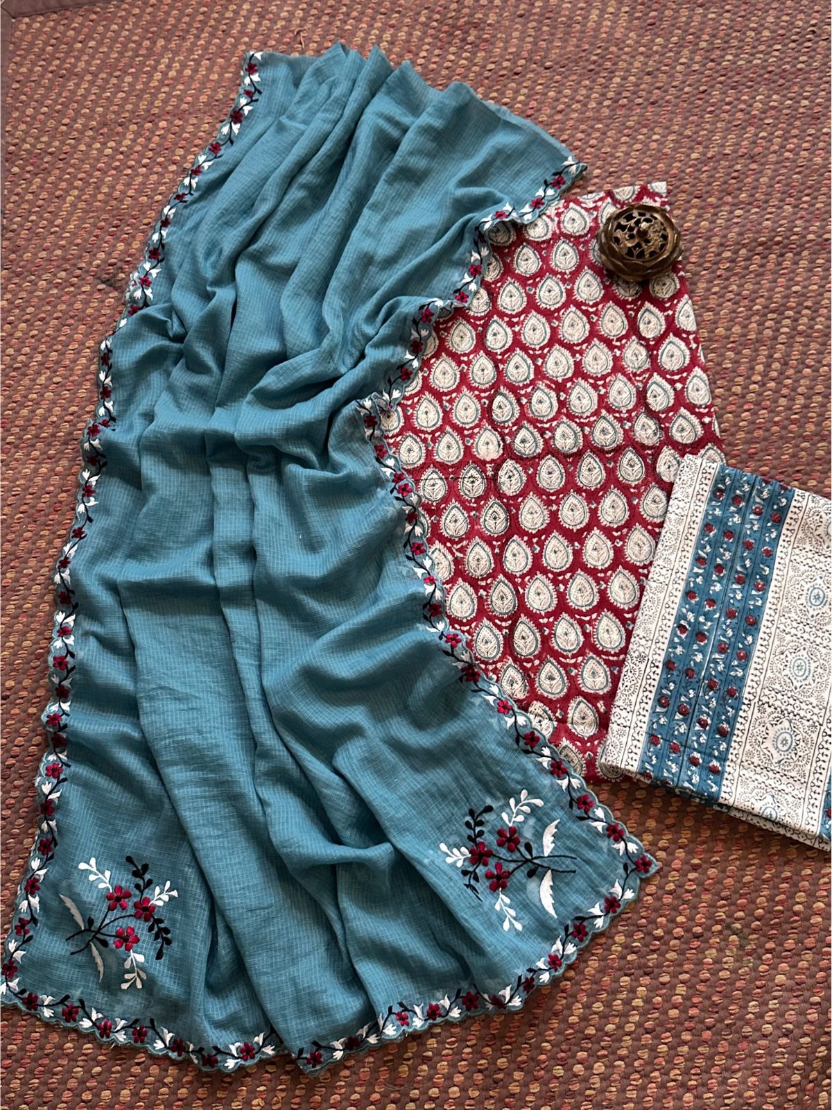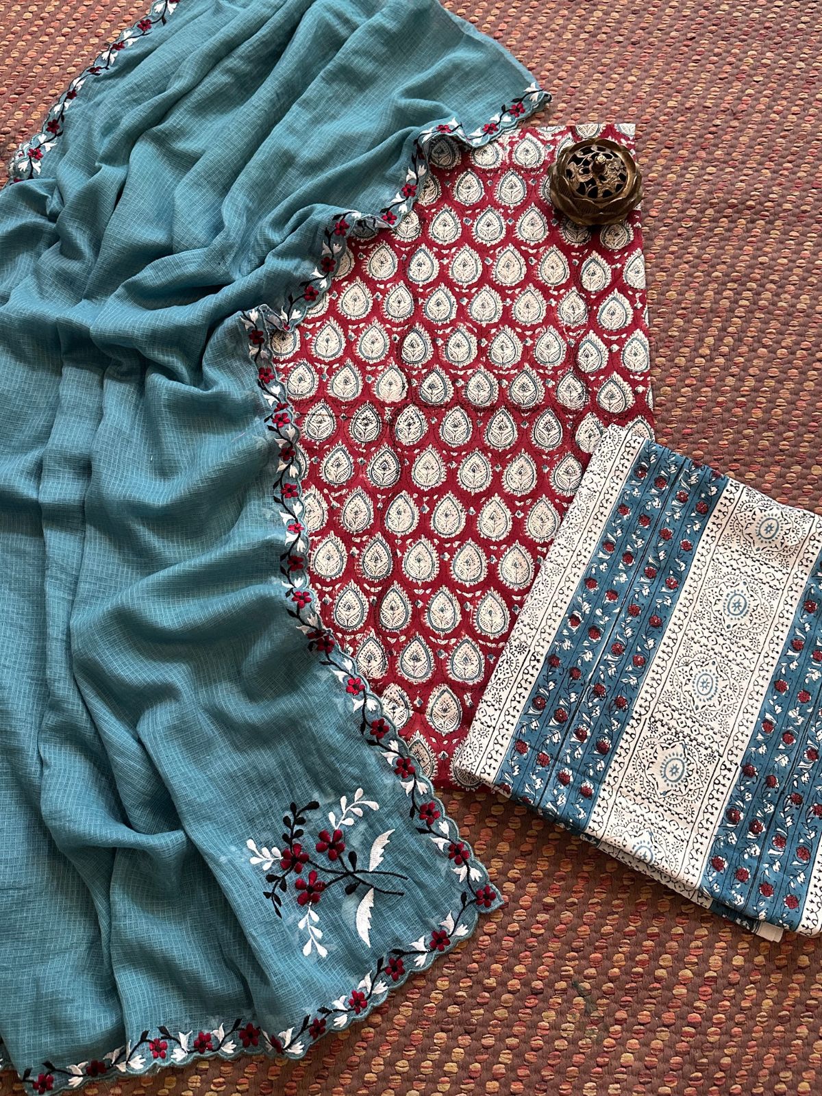 Pure Cotton Hand blocked Set with Embroidered Dupatta