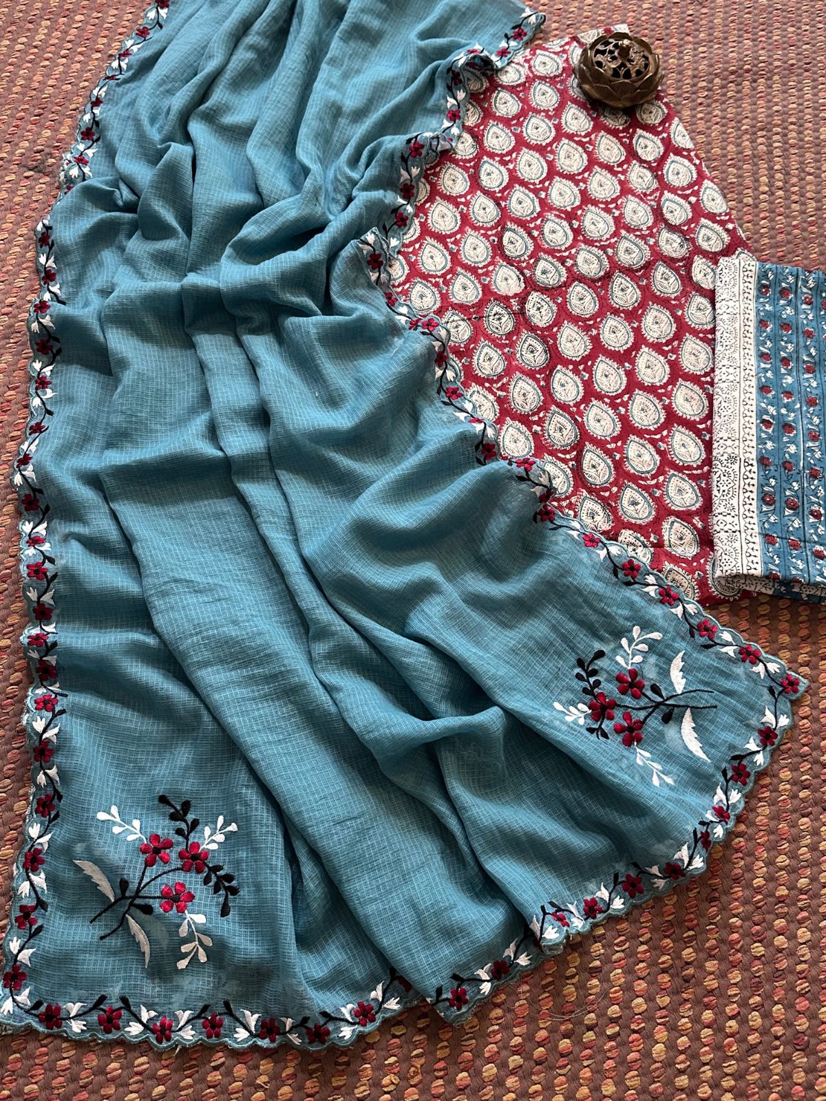 Dupatta: 2.5 meter Pure Soft Kota Doria with exclusively handcrafted embroidery done on all sides of the dupatta with scalloping.