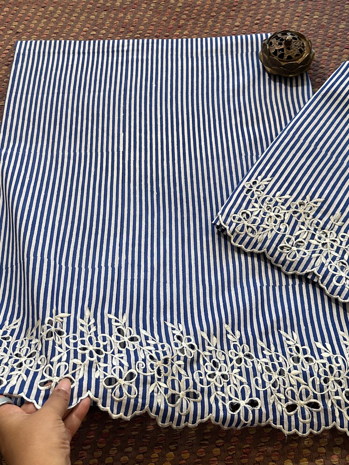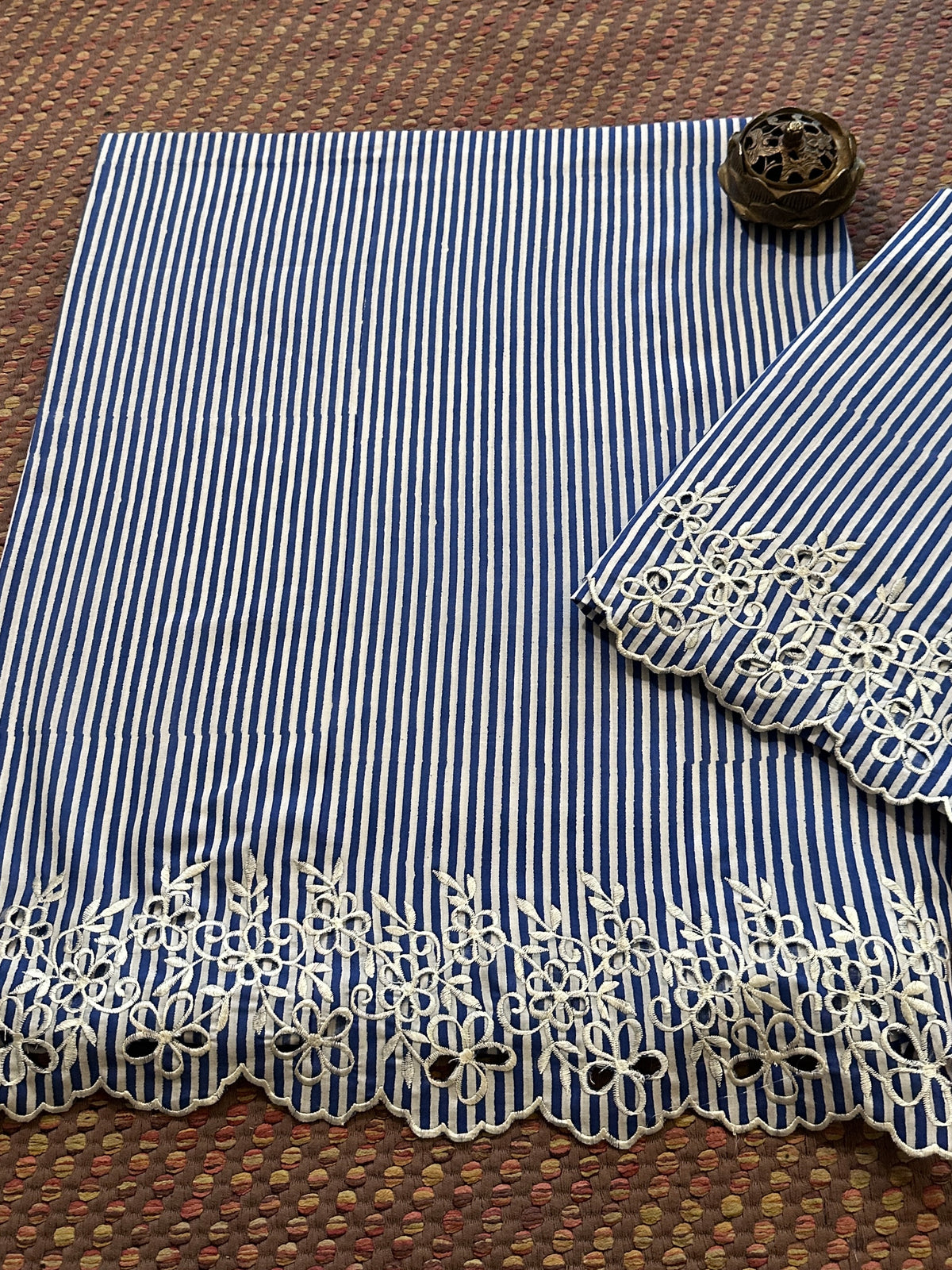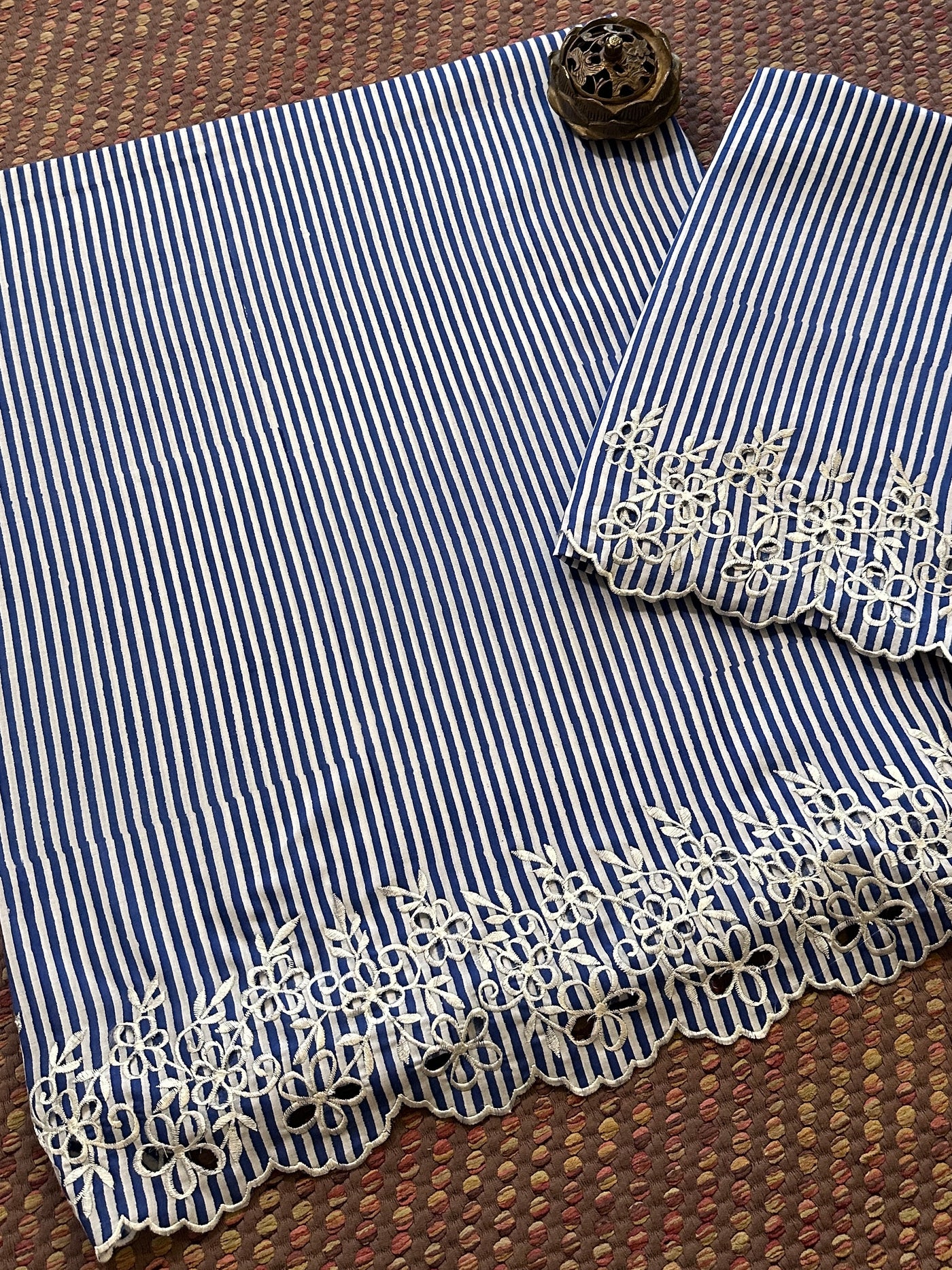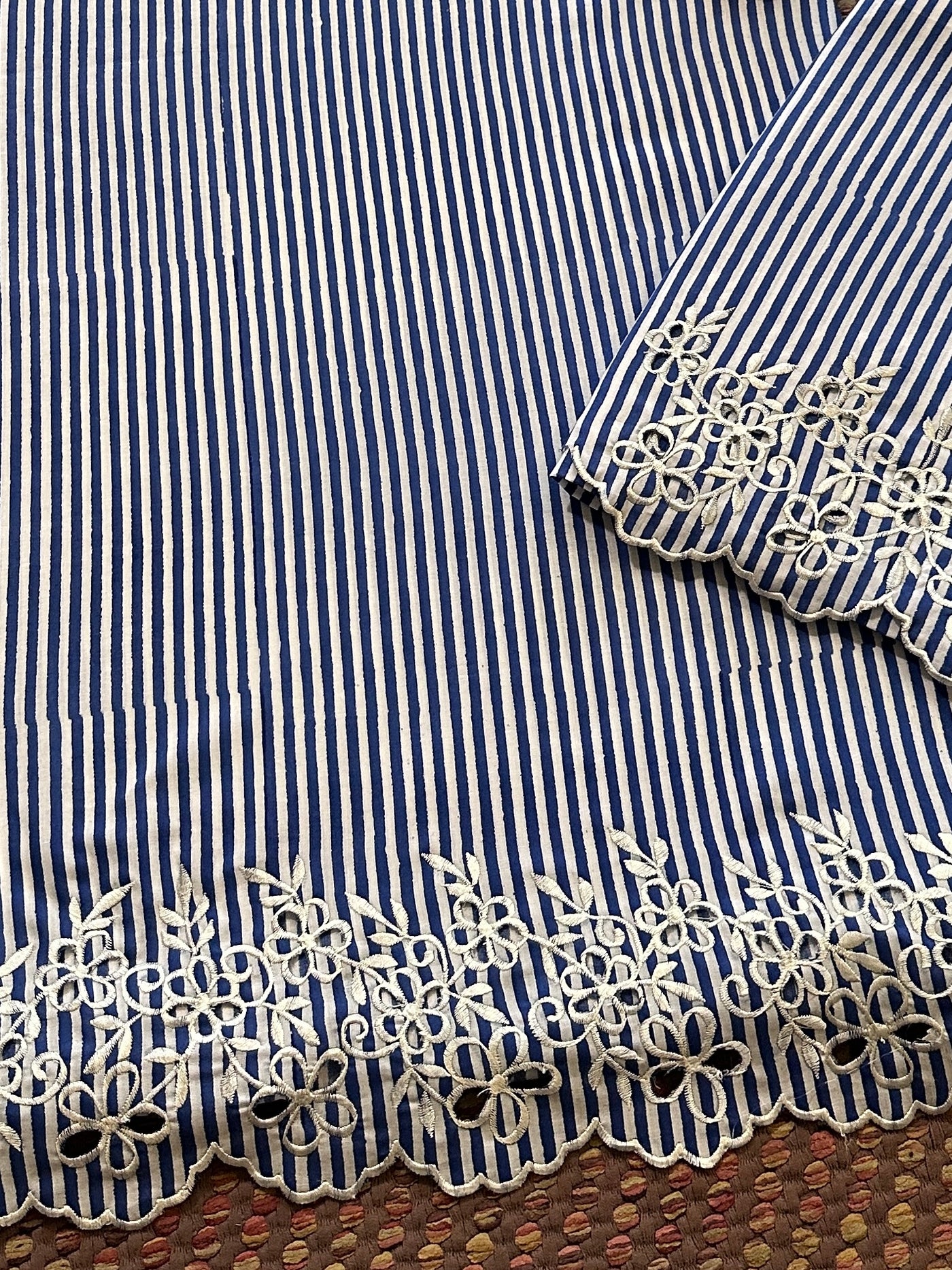 • Bottom:  Soft Pure cotton in handblocked 2.5 meter with exclusive cutwork embroidery done  width of cutwork embroidery will be approx. 12 inches when stitched. *** Embroidery done in this set is delicate, therefore Dry Clean Only.