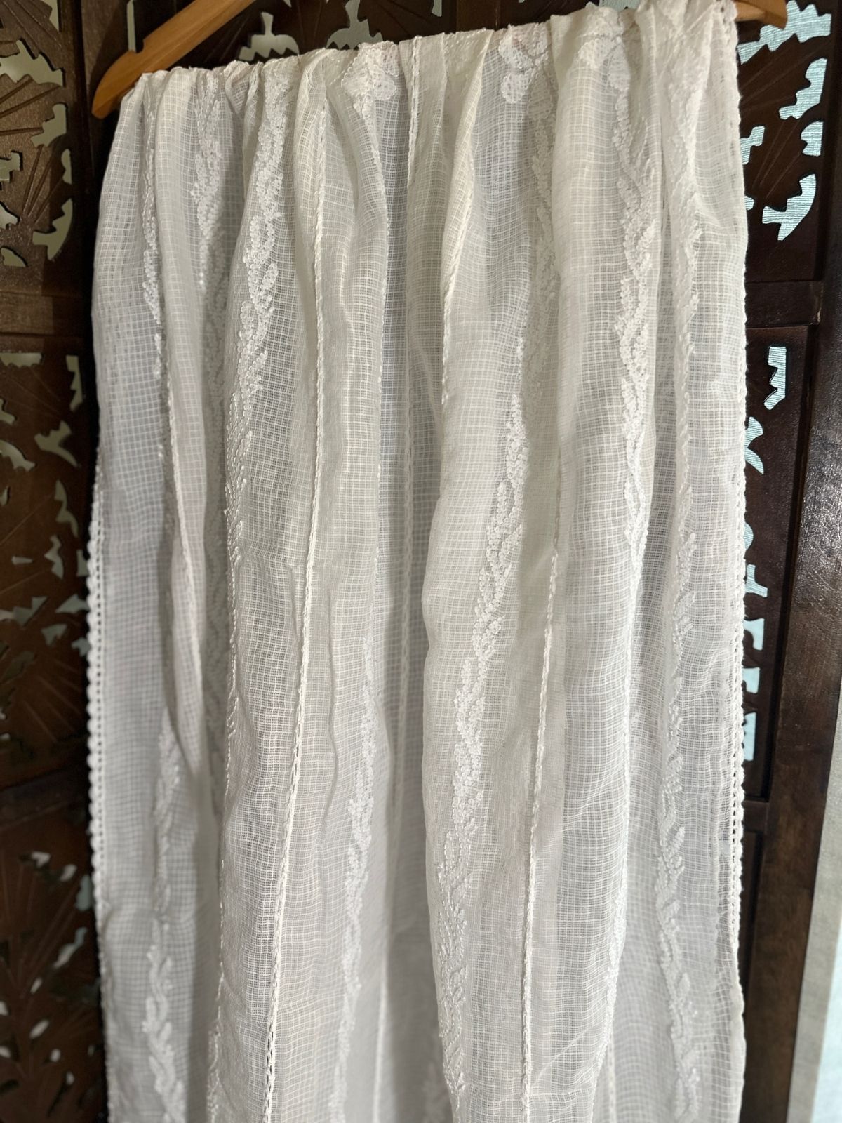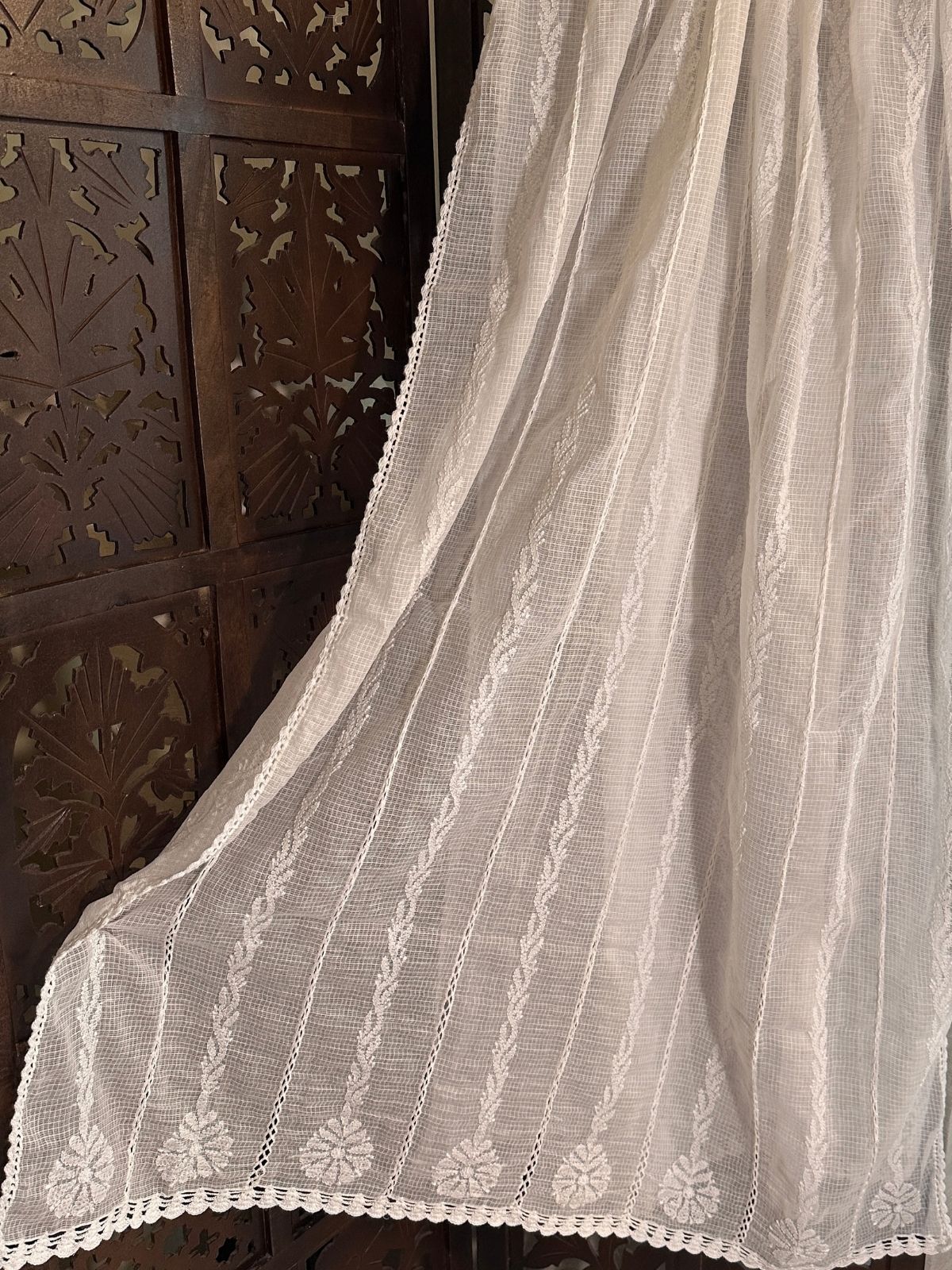 2.5 meter soft kota doria with chikankari hand embroidery and crochet lace border.