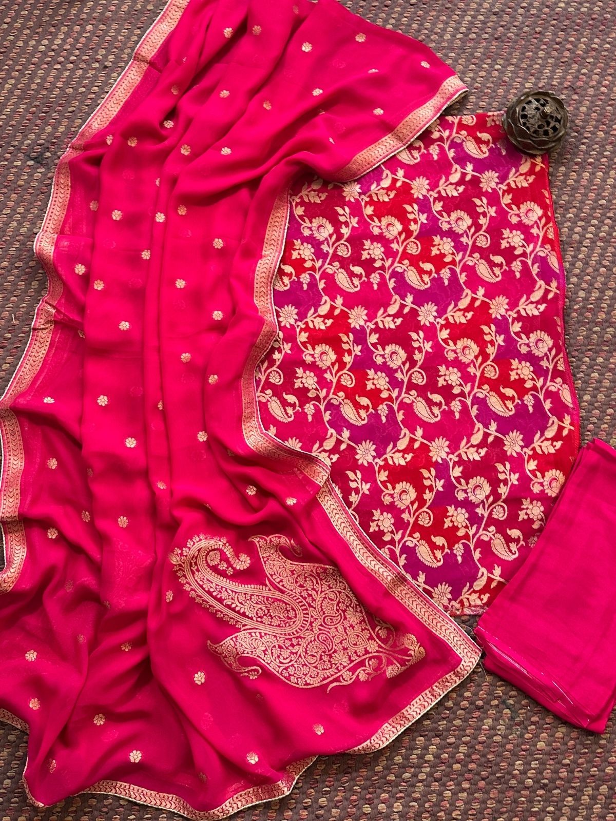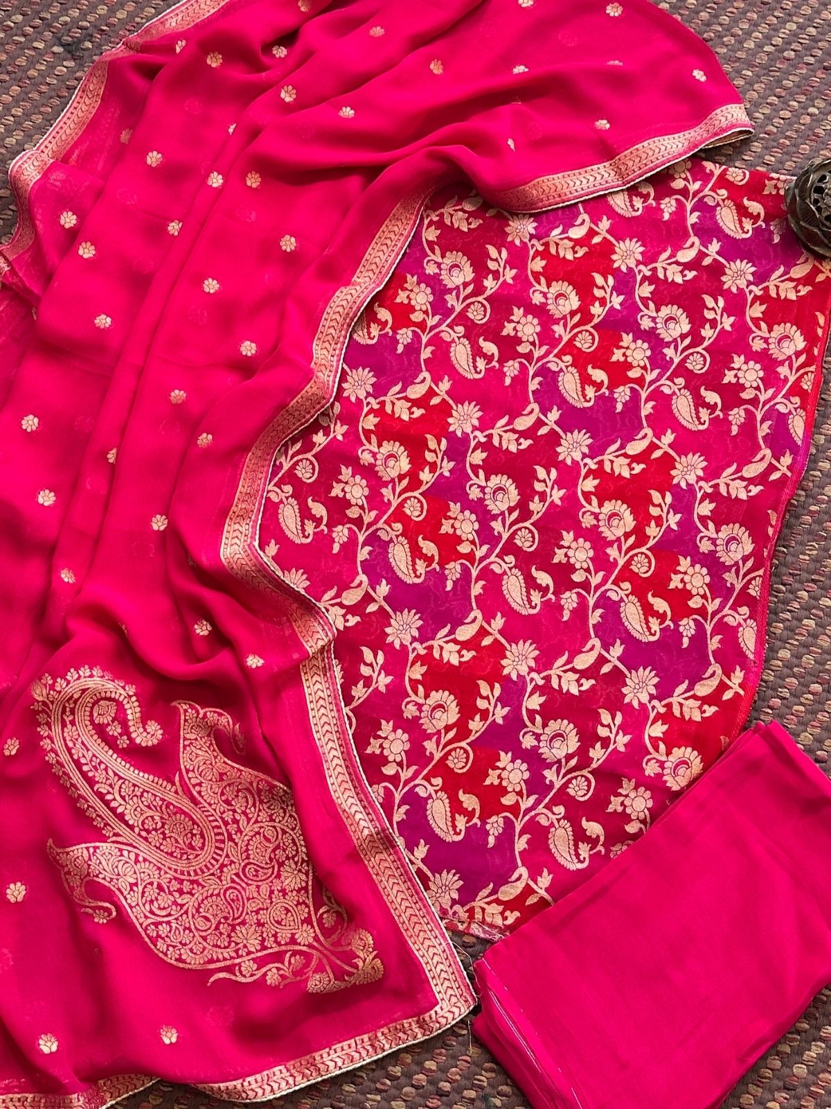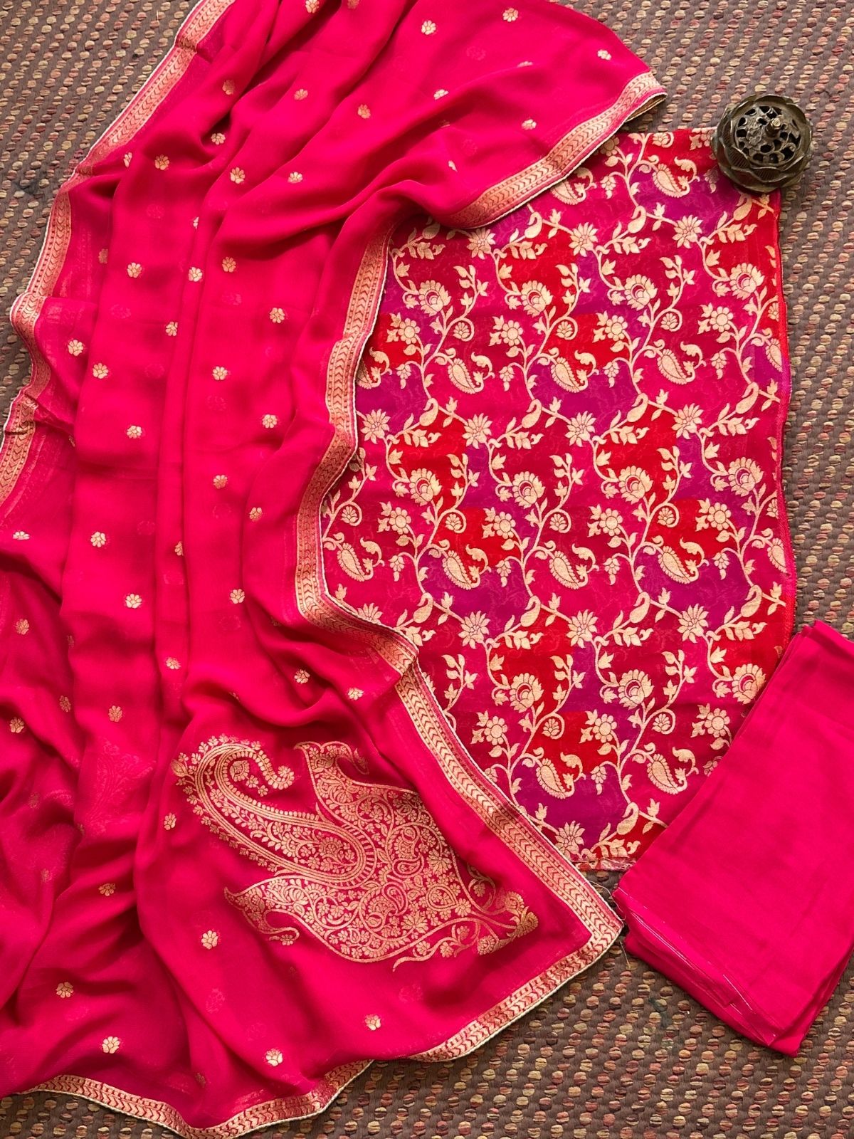 Kurti: Fabric: Pure georgette fabric, 2.5 meter, with benarsi weaving- khaddi. Dupatta: Pure georgette dupatta with benarsi weave. Bottom: 2.5 meter shantoon.