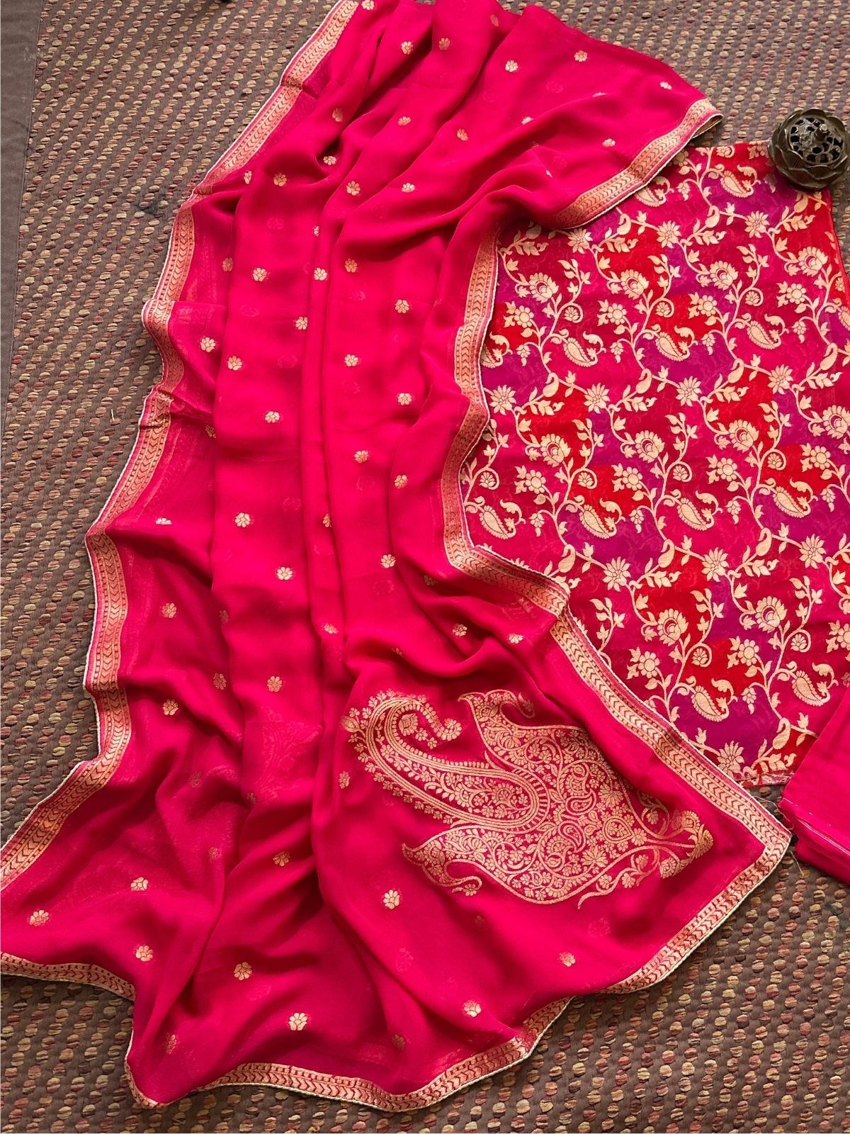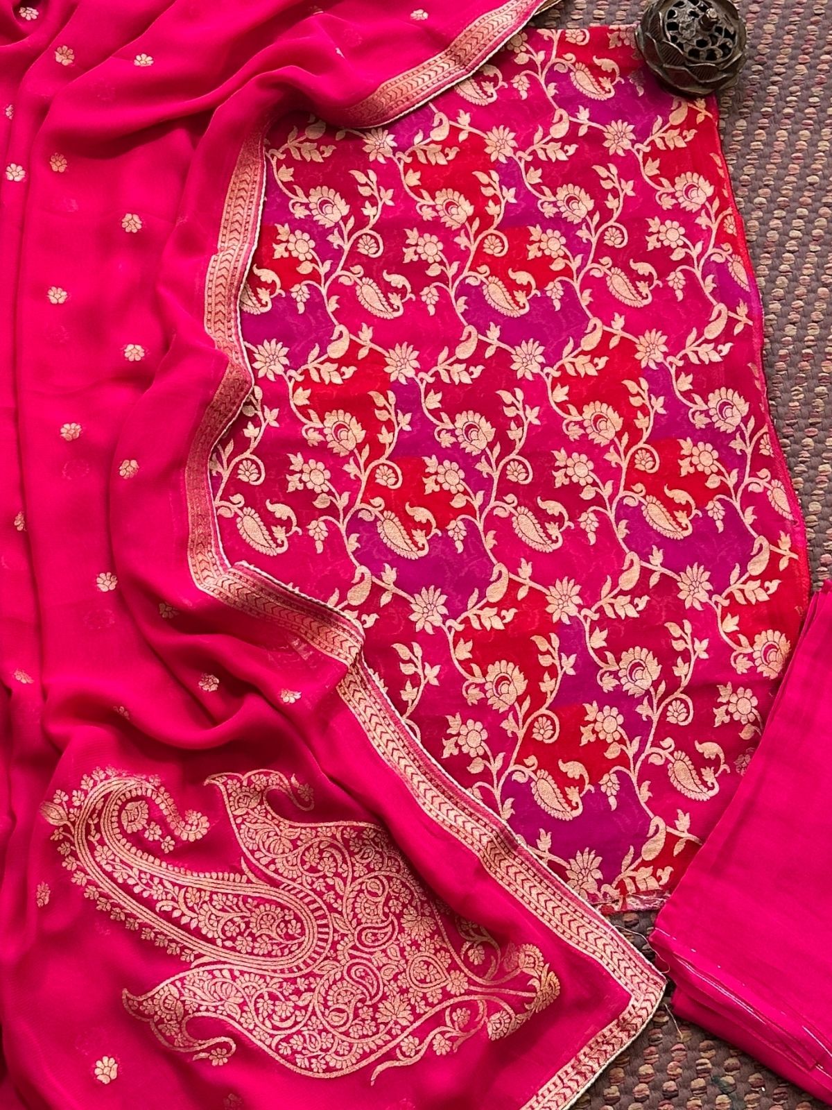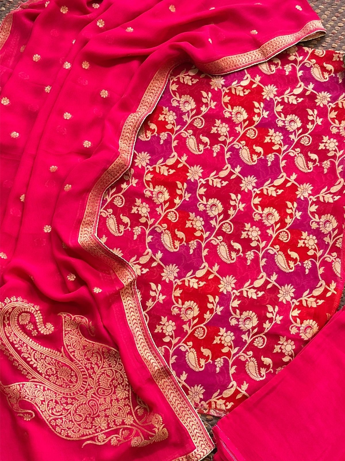 Kurti: Fabric: Pure georgette fabric, 2.5 meter, with benarsi weaving- khaddi. Dupatta: Pure georgette dupatta with benarsi weave. Bottom: 2.5 meter shantoon.