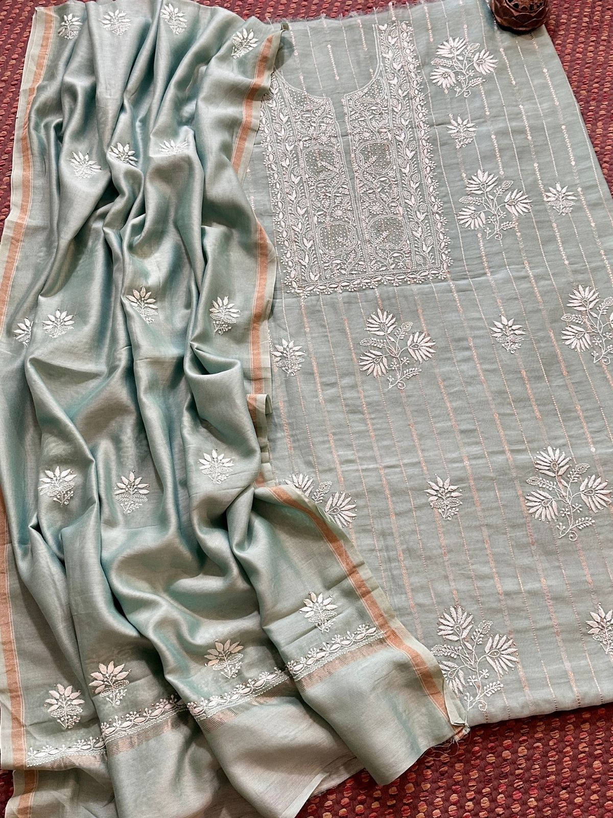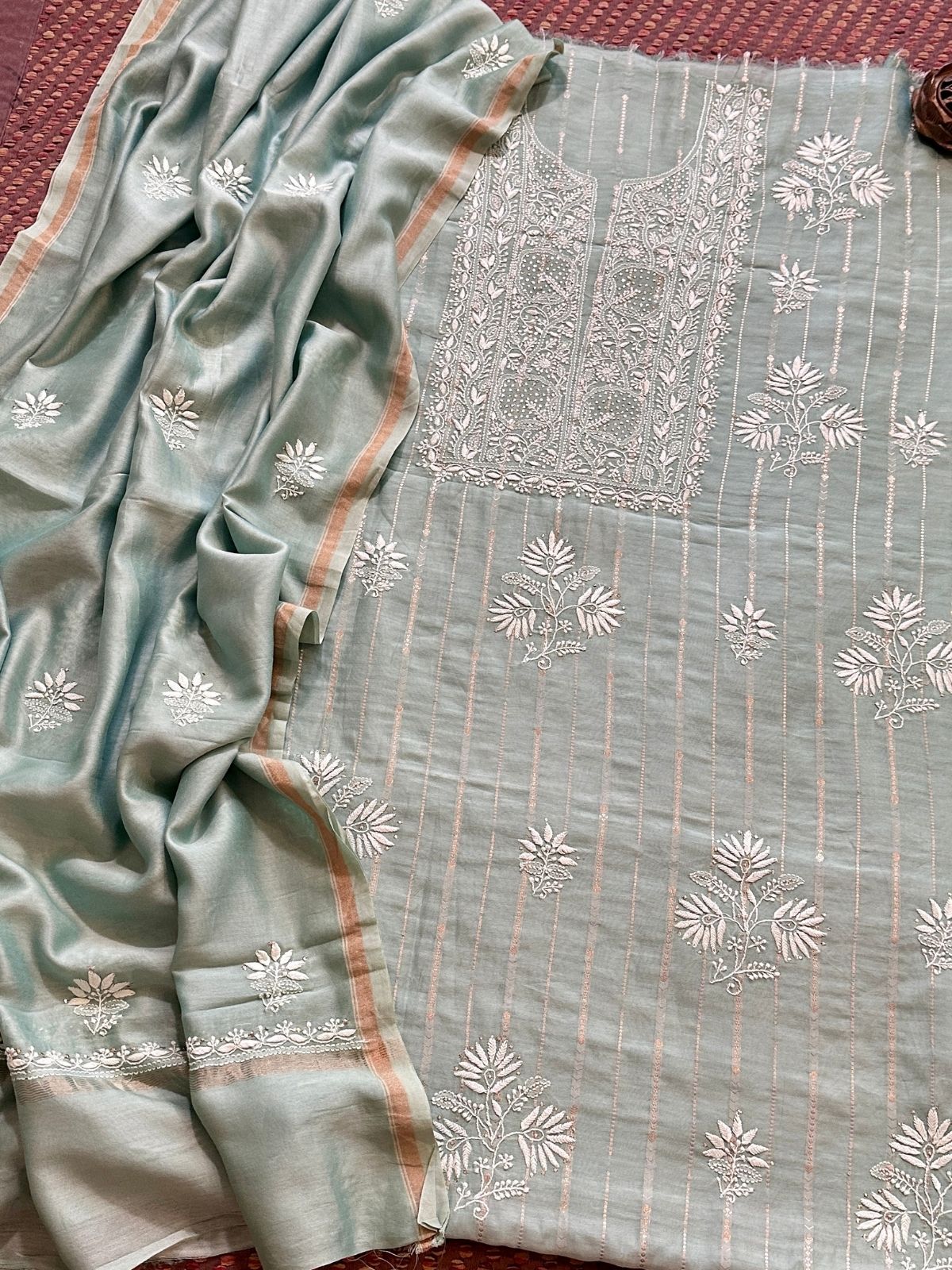 Kurti Fabric: Malmal Maheshwari fabric 3 meter, with exclusive chikankari hand embroidery done with mukesh work, will need a inner/lining. Shade - Sea Green. Embroidery is done on front, back side of kurti has small motifs and sleeve have embroidery with mukesh work.