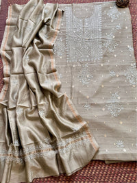 Kurti Fabric: Malmal Maheshwari fabric 3 meter, with exclusive chikankari hand embroidery done with mukesh work and benarsi motifs, will need a inner/lining. Shade - Champagne beigish.
