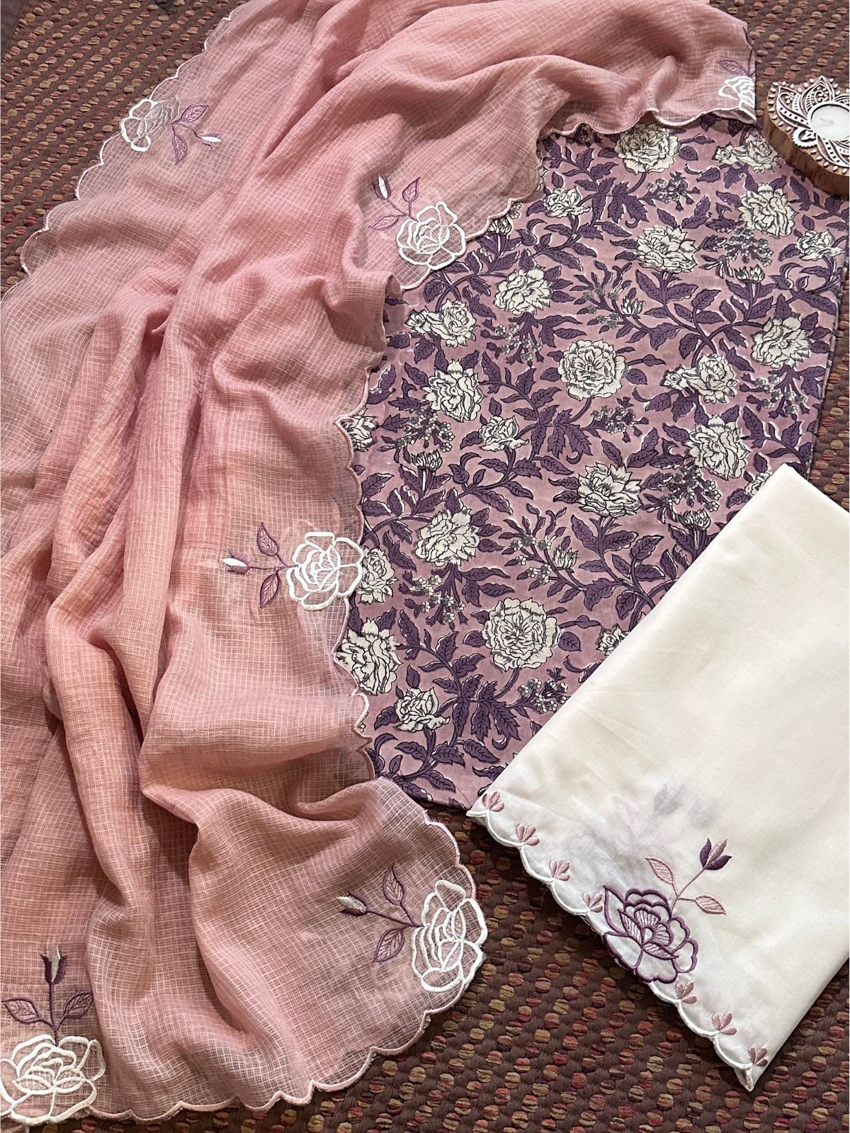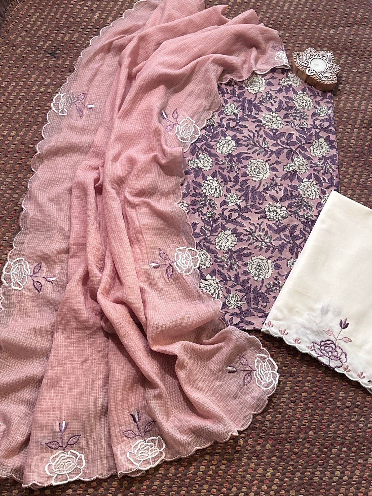 Pure Cotton Hand-block Fabric with Embroidered Bottom & Kota Doria Dupatta - Unstitched Set