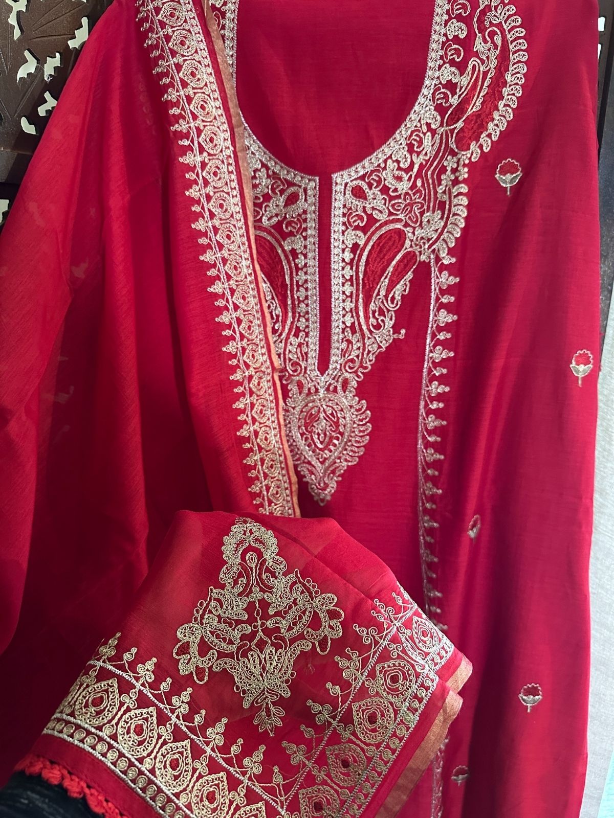Kurti Fabric: Mulmul Maheshwari fabric 2.5 meter, with embroidery, will need a lining/inner. Shade: Red